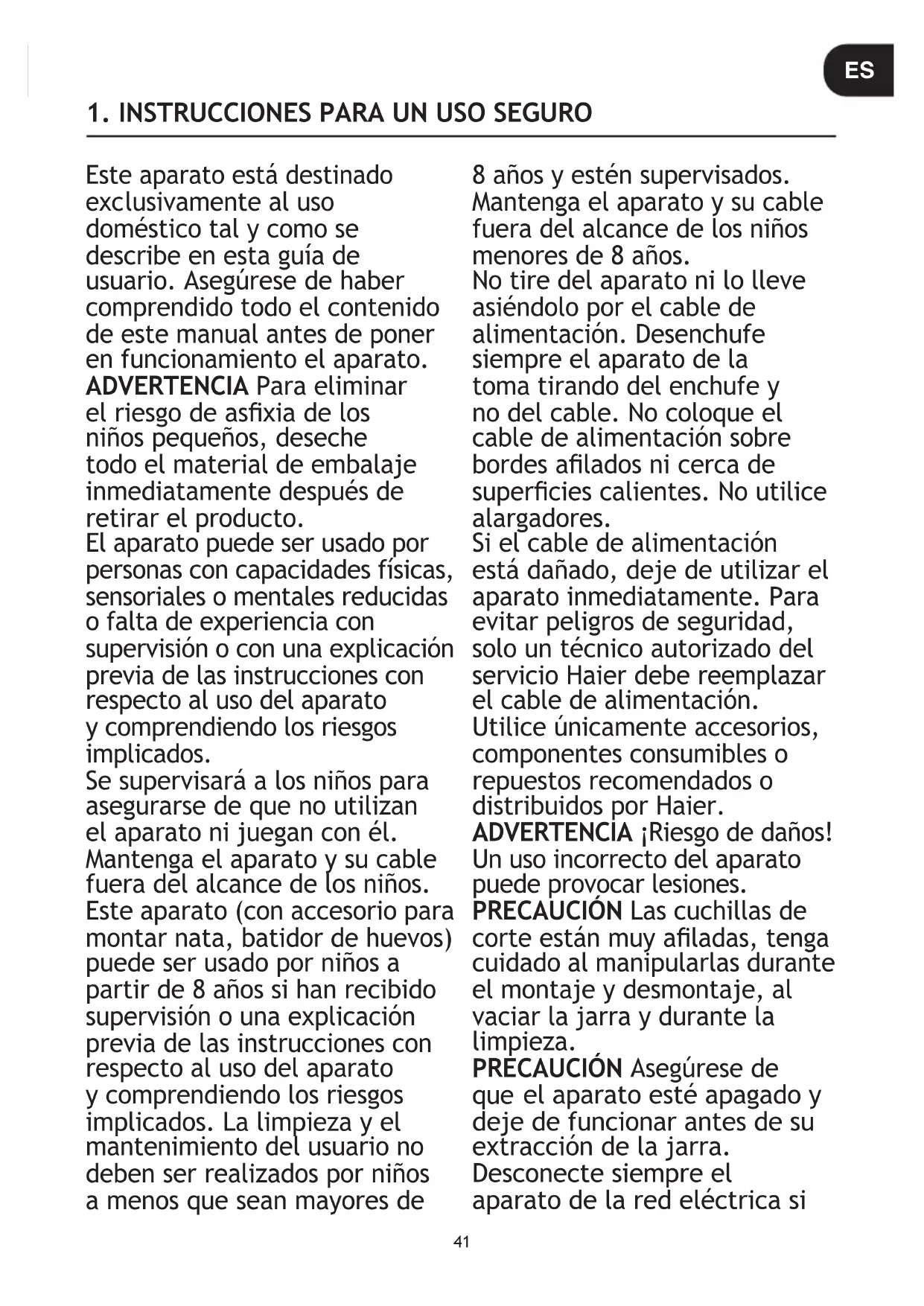 funcionamento. Espere até que a unidade arrefeça completamente antes de voltar a ser utilizada.41 Este aparato está destinado exc lusivamente al uso doméstico tal y como se describe en esta guía de usuario. Asegúrese de haber comprendido todo el contenido de este manual antes de poner en funcionamiento el aparato. ADVERTENCIA Para eliminar el riesgo de asxia de los niños pequeños, deseche todo el material de embalaje inmediatamente después de retirar el producto. El aparato puede ser usado por personas con capacidades físicas, sensoriales o mentales reducidas o falta de experiencia con supervisión o con una explicación previa de las instrucciones con respecto al uso del aparato y comprendiendo los riesgos implicados. Se supervisará a los niños para asegurarse de que no utilizan el aparato ni juegan con él. Mantenga el aparato y su cable fuera del alcance de los niños. Este aparato (con accesorio para montar nata, batidor de huevos) puede ser usado por niños a partir de 8 años si han recibido supervisión o una explicación previa de las instrucciones con respecto al uso del aparato y comprendiendo los riesgos implicados. La limpieza y el mantenimiento del usuario no deben ser realizados por niños a menos que sean mayores de 8 años y estén supervisados. Mantenga el aparato y su cable fuera del alcance de los niños menores de 8 años. No tire del aparato ni lo lleve asiéndolo por el cable de alimentación. Desenchufe siempre el aparato de la toma tirando del enchufe y no del cable. No coloque el cable de alimentación sobre bordes alados ni cerca de supercies calientes. No utilice alargadores. Si el cable de alimentación está dañado, deje de utilizar el aparato inmediatamente. Para evitar peligros de seguridad, solo un técnico autorizado del servicio Haier debe reemplazar el cable de alimentación. Utilice únicamente accesorios, componentes consumibles o repuestos recomendados o distribuidos por Haier. ADVERTENCIA ¡Riesgo de daños! Un uso incorrecto del aparato puede provocar lesiones. PRECAUCIÓN Las cuchillas de corte están muy aladas, tenga cuidado al manipularlas durante el montaje y desmontaje, al vaciar la jarra y durante la limpieza. PRECAUCIÓN Asegúrese de que el aparato esté apagado y deje de funcionar antes de su extracción de la jarra. Desconecte siempre el aparato de la red eléctrica si