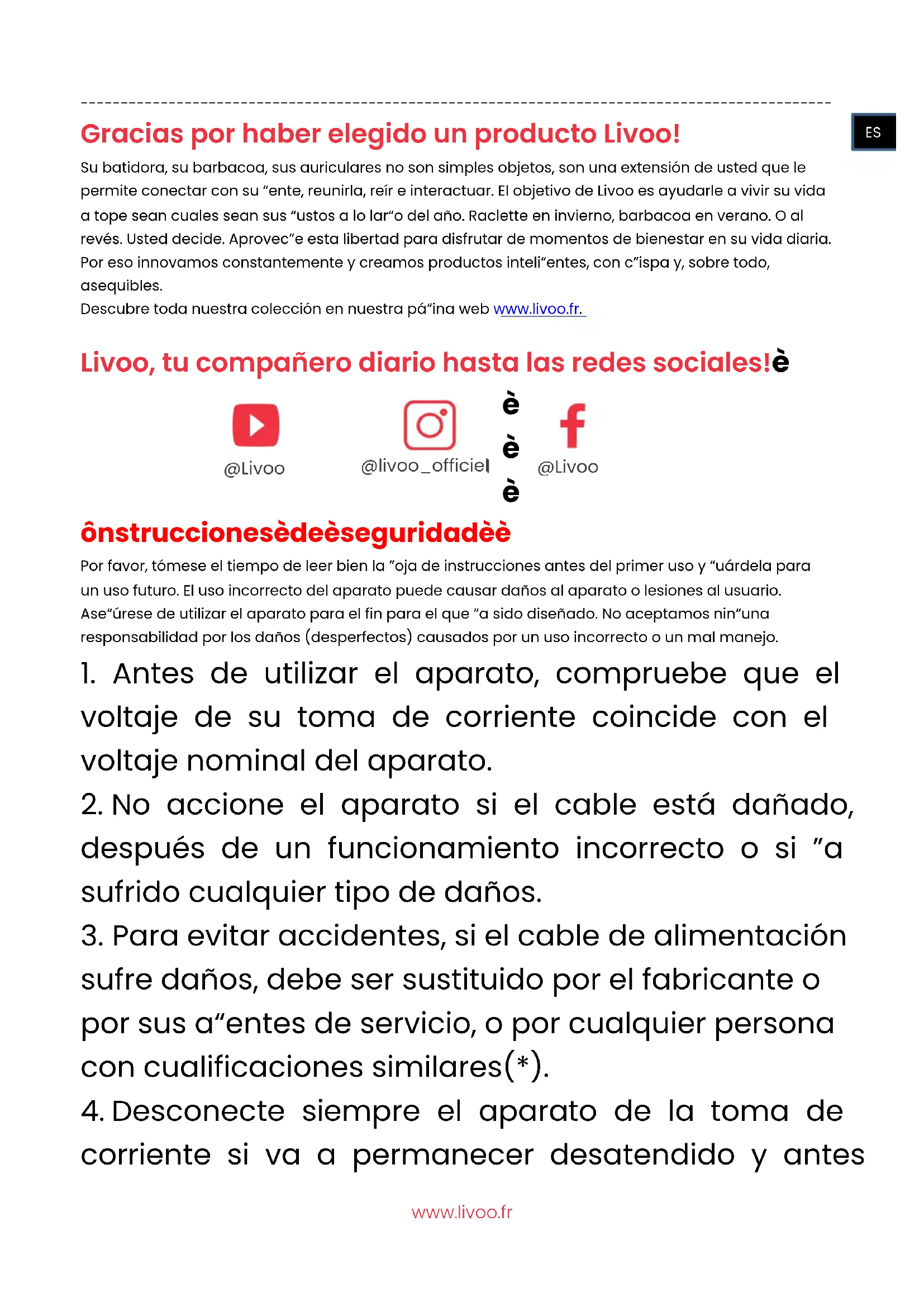 Gracias por haber elegido un producto Livoo! Su batidora, su barbacoa, sus auriculares no son simples objetos, son una extensión de usted que le permite conectar con su gente, reunirla, reír e interactuar. El objetivo de Livoo es ayudarle a vivir su vida a tope sean cuales sean sus gustos a lo largo del año. Raclette en invierno, barbacoa en verano. O al revés. Usted decide. Aproveche esta libertad para disfrutar de momentos de bienestar en su vida diaria. Por eso innovamos constantemente y creamos productos inteligentes, con chispa y, sobre todo, asequibles. Descubre toda nuestra colección en nuestra página web www.livoo.fr. Livoo, tu compañero diario hasta las redes sociales!