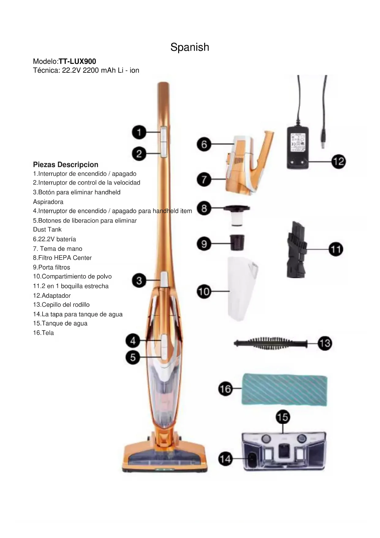 12.Adaptador 13.Cepillo del rodillo 14.La tapa para tanque de agua 15.Tanque de agua 16.TelaSeguridad