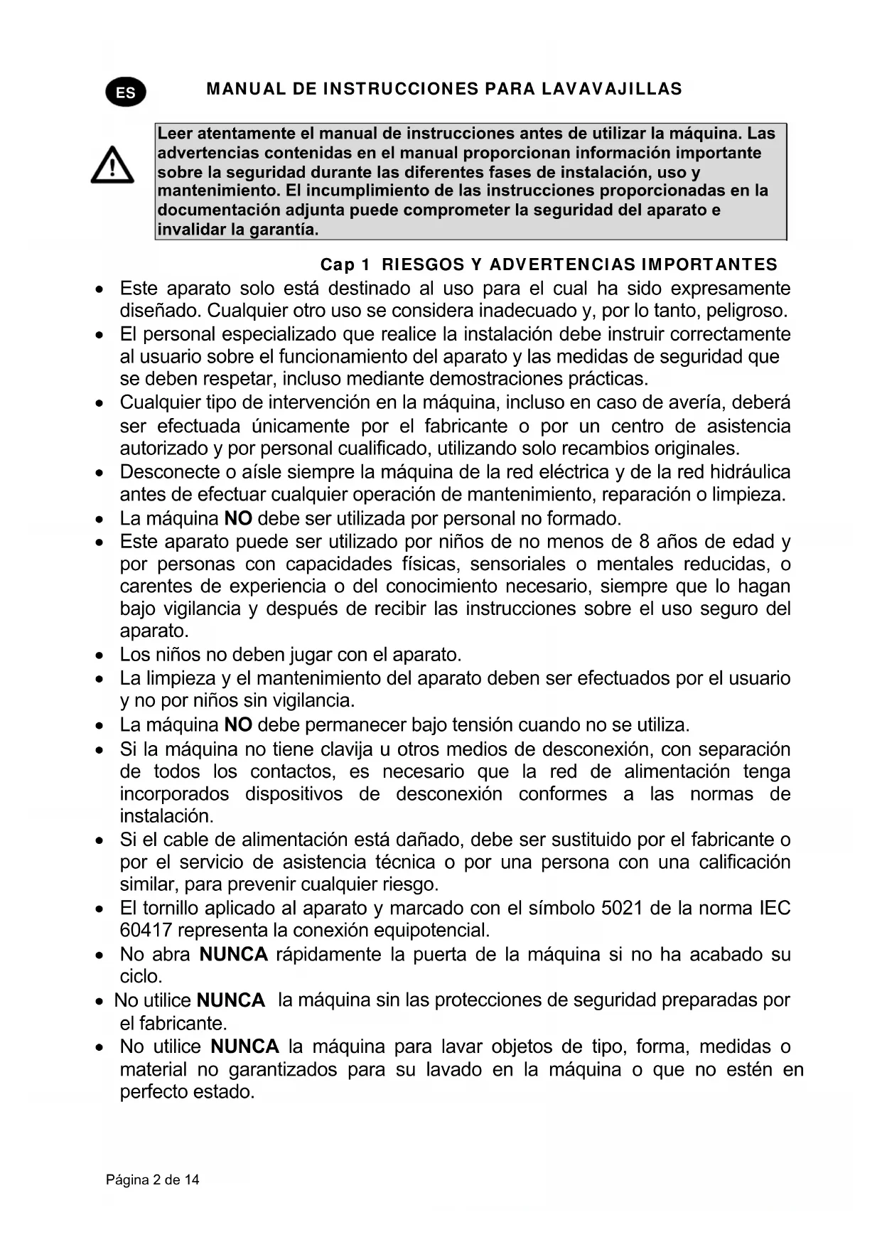 Este aparato solo está destinado al uso para el cual ha sido expresamente diseñado. Cualquier otro uso se considera inadecuado y, por lo tanto, peligroso. El personal especializado que realice la instalación debe instruir correctamente al usuario sobre el funcionamiento del aparato y las medidas de seguridad que se deben respetar, incluso mediante demostraciones prácticas. Cualquier tipo de intervención en la máquina, incluso en caso de avería, deberá ser efectuada únicamente por el fabricante o por un centro de asistencia autorizado y por personal cualificado, utilizando solo recambios originales. Desconecte o aísle siempre la máquina de la red eléctrica y de la red hidráulica antes de efectuar cualquier operación de mantenimiento, reparación o limpieza. La máquina NO debe ser utilizada por personal no formado. Este aparato puede ser utilizado por niños de no menos de 8 años de edad y por personas con capacidades físicas, sensoriales o mentales reducidas, o carentes de experiencia o del conocimiento necesario, siempre que lo hagan bajo vigilancia y después de recibir las instrucciones sobre el uso seguro del aparato. Los niños no deben jugar con el aparato. La limpieza y el mantenimiento del aparato deben ser efectuados por el usuario y no por niños sin vigilancia. La máquina NO debe permanecer bajo tensión cuando no se utiliza. Si la máquina no tiene clavija u otros medios de desconexión, con separación de todos los contactos, es necesario que la red de alimentación tenga incorporados dispositivos de desconexión conformes a las normas de instalación. Si el cable de alimentación está dañado, debe ser sustituido por el fabricante o por el servicio de asistencia técnica o por una persona con una calificación similar, para prevenir cualquier riesgo. El tornillo aplicado al aparato y marcado con el símbolo 5021 de la norma IEC 60417 representa la conexión equipotencial. No abra NUNCA rápidamente la puerta de la máquina si no ha acabado su ciclo. No utilice NUNCA la máquina sin las protecciones de seguridad preparadas por el fabricante. No utilice NUNCA la máquina para lavar objetos de tipo, forma, medidas o material no garantizados para su lavado en la máquina o que no estén en perfecto estado.MANUAL DE INSTRUCCIONES PARA LAVAVAJILLAS Página 3 de 14