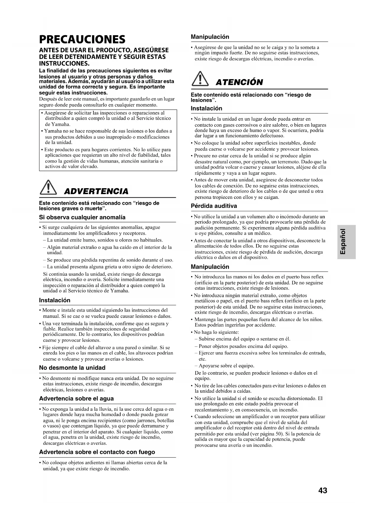 - Si surge cualquiera de las siguientes anomalías, apague inmediatamente los amplificadores y receptores. – La unidad emite humo, sonidos u olores no habituales. – Algún material extraño o agua ha caído en el interior de la unidad. – Se produce una pérdida repentina de sonido durante el uso. – La unidad presenta alguna grieta u otro signo de deterioro. Si continúa usando la unidad, existe riesgo de descarga eléctrica, incendio o avería. Solicite inmediatamente una inspección o reparación al distribuidor a quien compró la unidad o al Servicio técnico de Yamaha. Instalación
