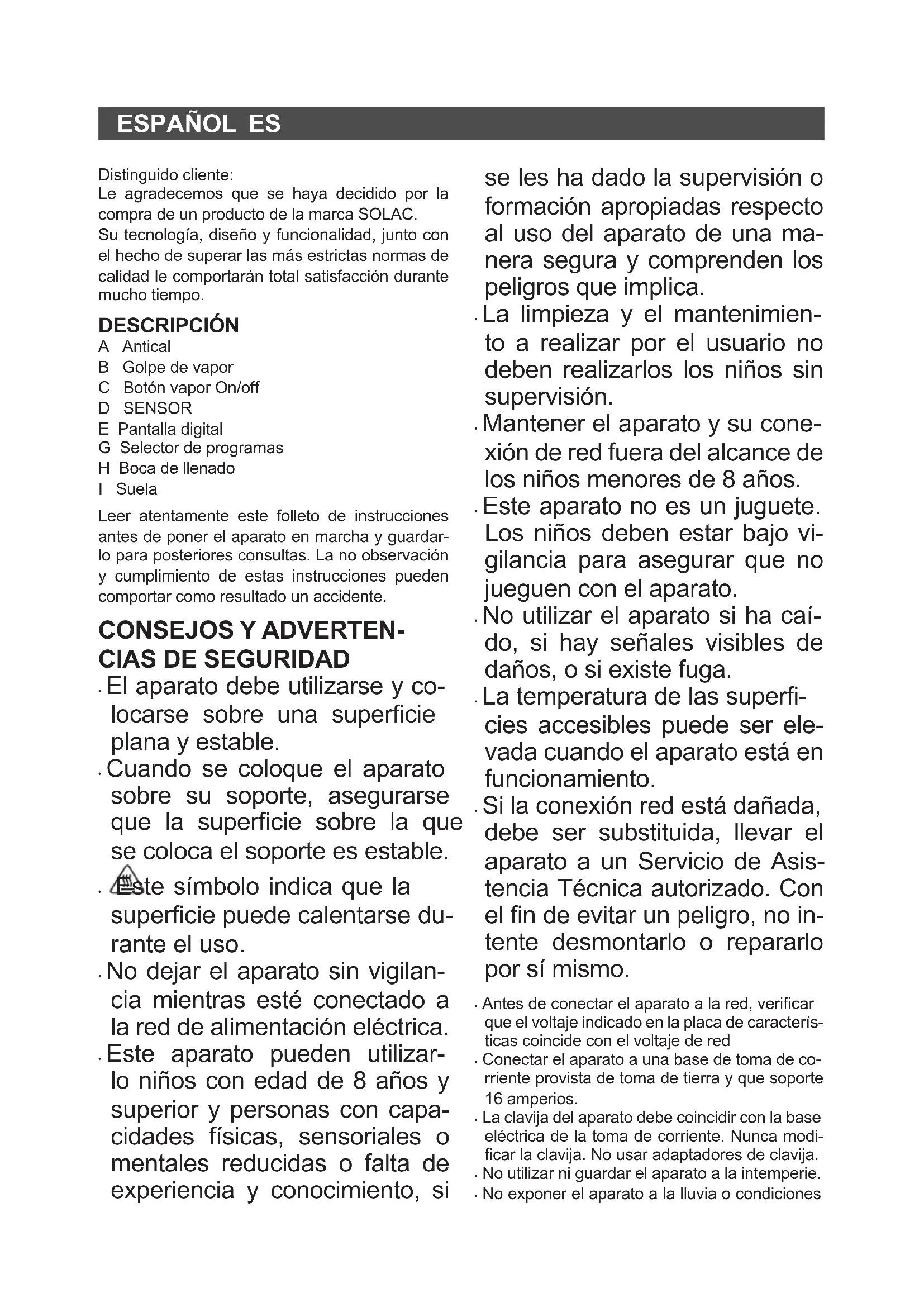 - El producto está exento de concentraciones de sustancias que se puedan considerar dañinas para el medio ambiente. Este símbolo signica que si desea desha- cerse del producto, una vez transcurrida la vida del mismo, debe depositarlo por los medios adecuados a manos de un gestor de re- siduos autorizado para la recogida selectiva de Residuos de Aparatos Eléctricos y Electrónicos (RAEE). Este aparato cumple con la Directiva 2014/35/EU de Baja Tensión, con la Directiva 2014/30/EU de Compatibilidad Electromagnética, con la Directi- va 2011/65/EU sobre restricciones a la utilización de determinadas sustancias peligrosas en apa- ratos eléctricos y electrónicos y con la Directiva 2009/125/EC sobre los requisitos de diseño eco- lógico aplicable a los productos relacionados con la energía.ENGLISH EN Dear customer, Many thanks for choosing to purchase a SOLAC brand product. Thanks to its technology, design and operation and the fact that it exceeds the strictest quality standards, a fully satisfactory use and long prod- uct life can be assured. DESCRIPTION A Antiscale B Steam blast C Steam On/Off button D SENSOR E Digital display G Program selector H Filling spout I Soleplate Read these instructions carefully before switching on the appliance and keep them for future refer- ence. Failure to follow and observe these instruc- tions may result in an accident.