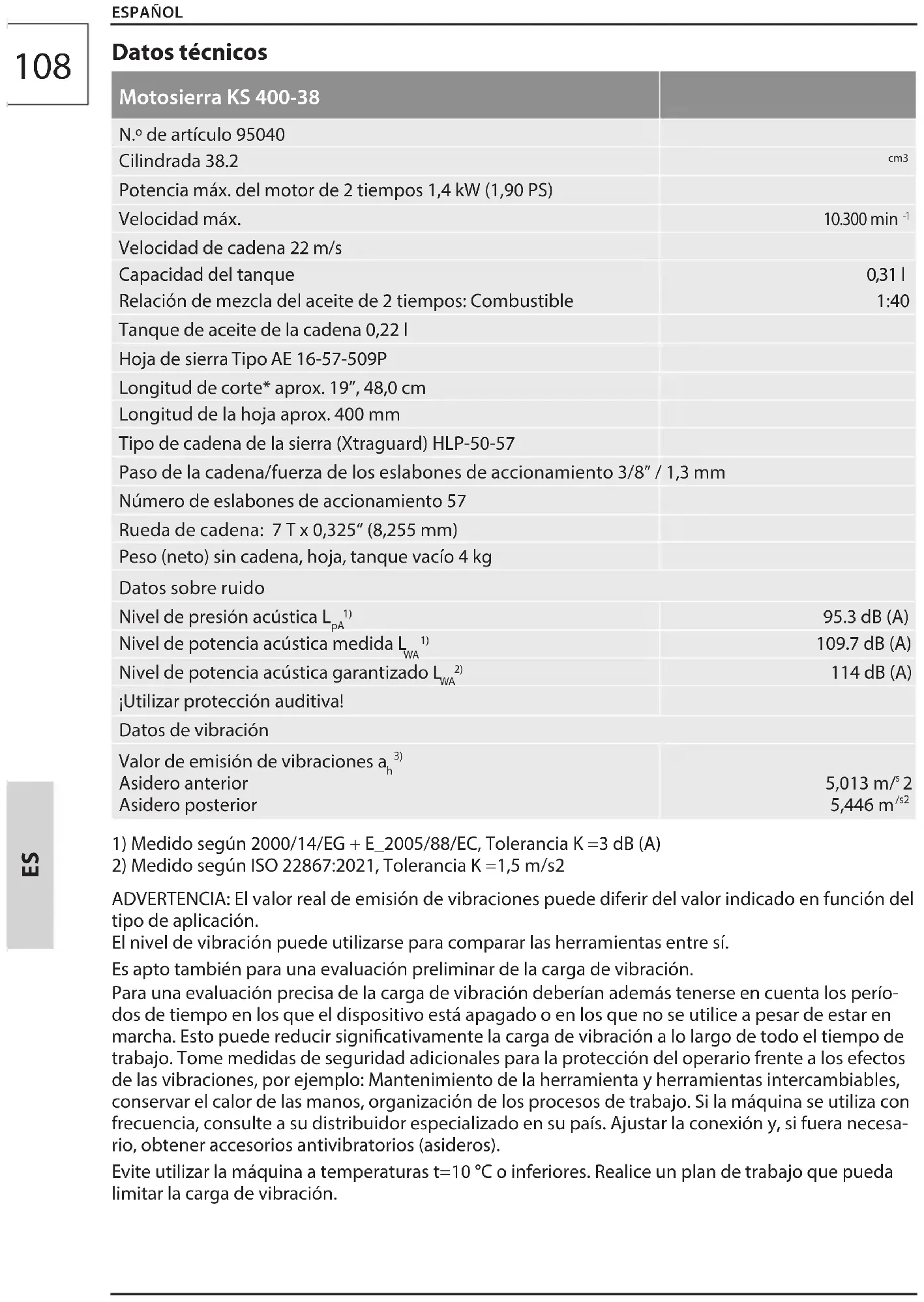Datos técnicos Motosierra KS 400-38 N.º de artículo 95040 Cilindrada 38.2 cm3 Potencia máx. del motor de 2 tiempos 1,4 kW (1,90 PS) Velocidad máx.