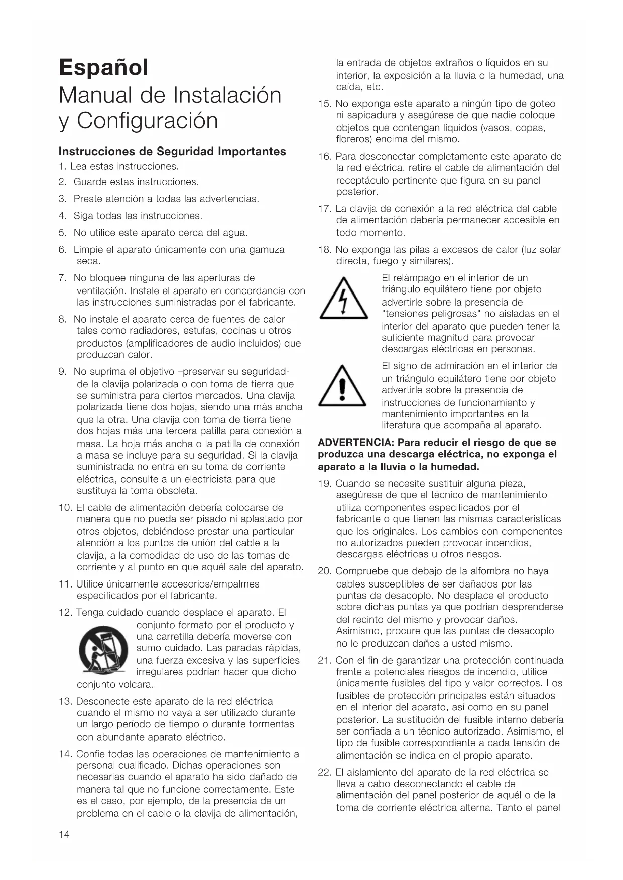 directa, fuego y similares). El relámpago en el interior de un triángulo equilátero tiene por objeto advertirle sobre la presencia de "tensiones peligrosas" no aisladas en el interior del aparato que pueden tener la suficiente magnitud para provocar descargas eléctricas en personas. El signo de admiración en el interior de un triángulo equilátero tiene por objeto advertirle sobre la presencia de instrucciones de funcionamiento y mantenimiento importantes en la literatura que acompaña al aparato. ADVERTENCIA: Para reducir el riesgo de que se produzca una descarga eléctrica, no exponga el aparato a la lluvia o la humedad.