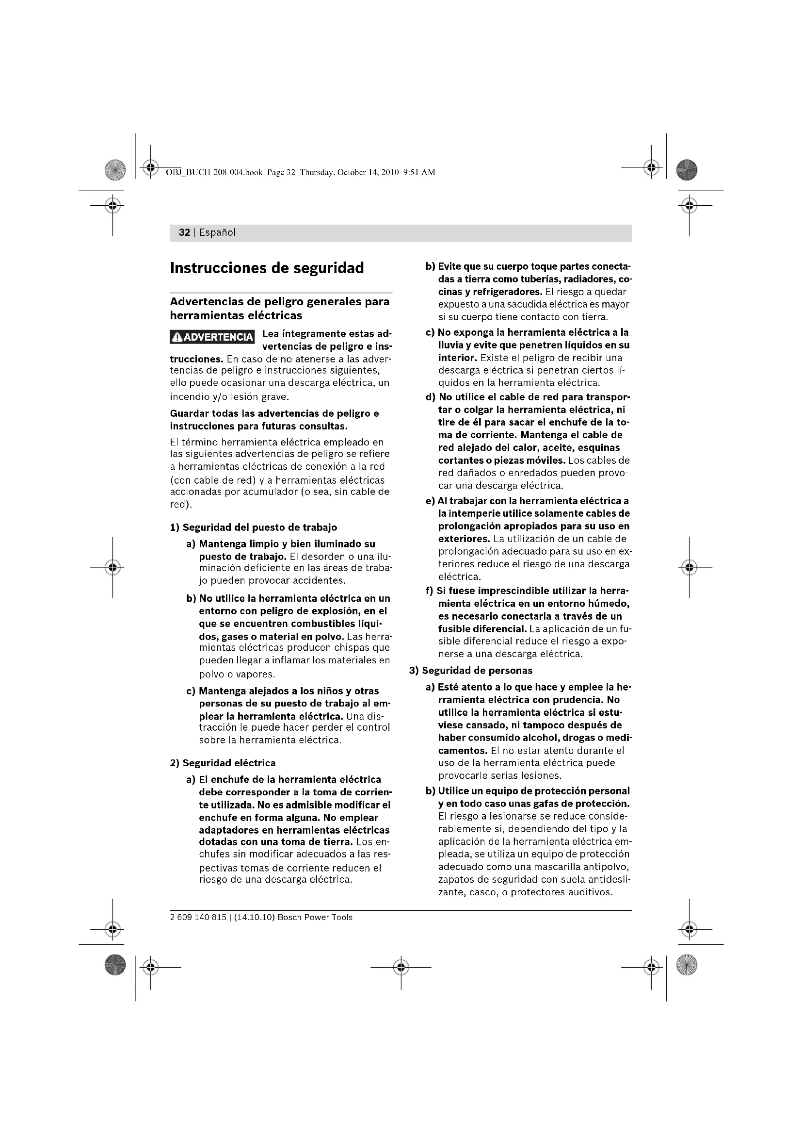 a) Esté atento a lo que hace y emplee la he- rramienta eléctrica con prudencia. No utilice la herramienta eléctrica si estu- viese cansado, ni tampoco después de haber consumido alcohol, drogas o medi- camentos. El no estar atento durante el uso de la herramienta eléctrica puede provocarle serias lesiones. b) Utilice un equipo de protección personal y en todo caso unas gafas de protección. El riesgo a lesionarse se reduce conside- rablemente si, dependiendo del tipo y la aplicación de la herramienta eléctrica em- pleada, se utiliza un equipo de protección adecuado como una mascarilla antipolvo, zapatos de seguridad con suela antidesli- zante, casco, o protectores auditivos. ADVERTENCIA OBJ_BUCH-208-004.book Page 32 Thursday, October 14, 2010 9:51 AMEspañol | 33 Bosch Power Tools 2 609 140 815 | (14.10.10) c) Evite una puesta en marcha fortuita. Asegurarse de que la herramienta eléc- trica esté desconectada antes de conec- tarla a la toma de corriente y/o al montar el acumulador, al recogerla, y al trans- portarla. Si transporta la herramienta eléctrica sujetándola por el interruptor de conexión/desconexión, o si alimenta la herramienta eléctrica estando ésta conec- tada, ello puede dar lugar a un accidente. d) Retire las herramientas de ajuste o lla- ves fijas antes de conectar la herramien- ta eléctrica. Una herramienta de ajuste o llave fija colocada en una pieza rotante puede producir lesiones al poner a funcio- nar la herramienta eléctrica. e) Evite posturas arriesgadas. Trabaje so- bre una base firme y mantenga el equili- brio en todo momento. Ello le permitirá controlar mejor la herramienta eléctrica en caso de presentarse una situación in- esperada. f) Lleve puesta una vestimenta de trabajo adecuada. No utilice vestimenta amplia ni joyas. Mantenga su pelo, vestimenta y guantes alejados de las piezas móviles. La vestimenta suelta, el pelo largo y las jo- yas se pueden enganchar con las piezas en movimiento. g) Siempre que sea posible utilizar unos equipos de aspiración o captación de polvo, asegúrese que éstos estén monta- dos y que sean utilizados correctamente. El empleo de estos equipos reduce los riesgos derivados del polvo.