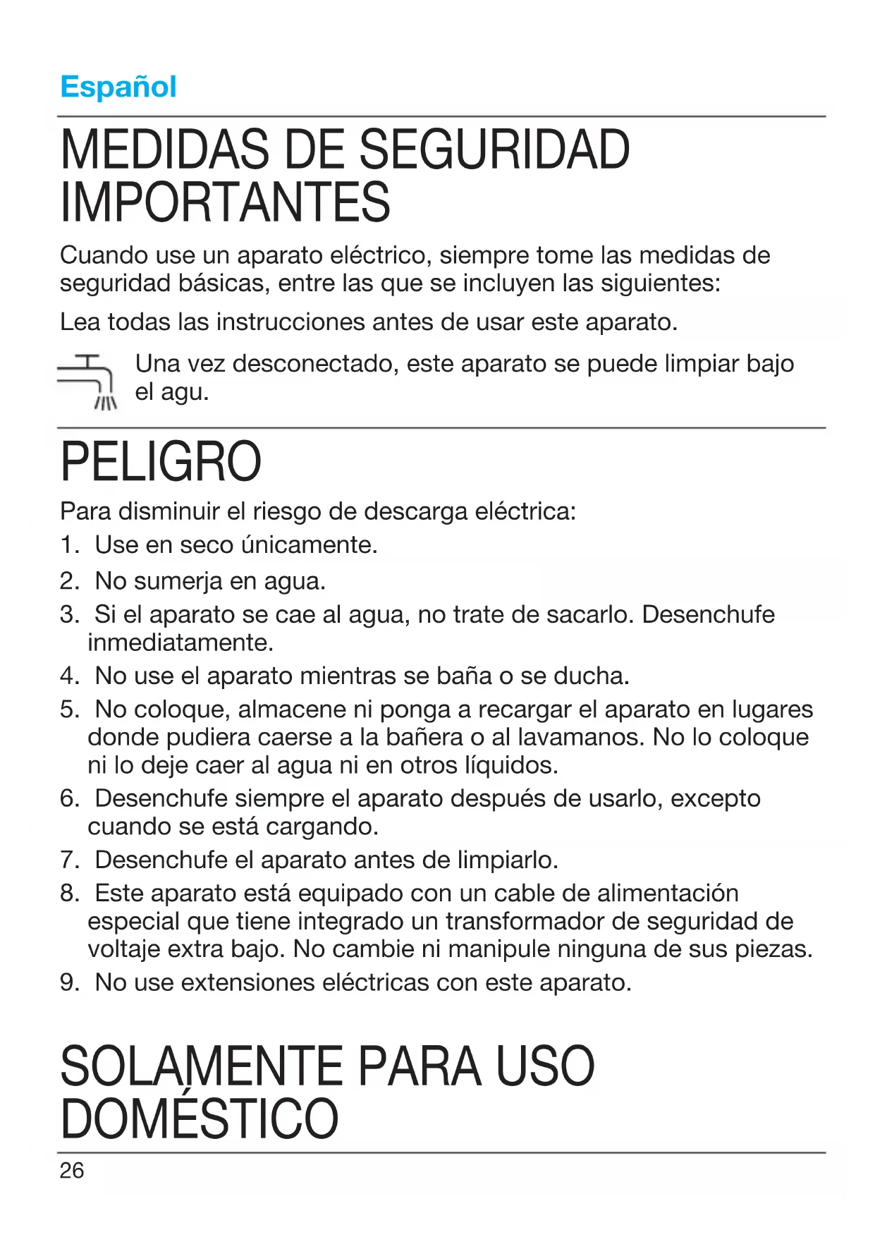 IMPORTANTES Cuando use un aparato eléctrico, siempre tome las medidas de seguridad básicas, entre las que se incluyen las siguientes: Lea todas las instrucciones antes de usar este aparato. Una vez desconectado, este aparato se puede limpiar bajo el agu. PELIGRO Para disminuir el riesgo de descarga eléctrica: