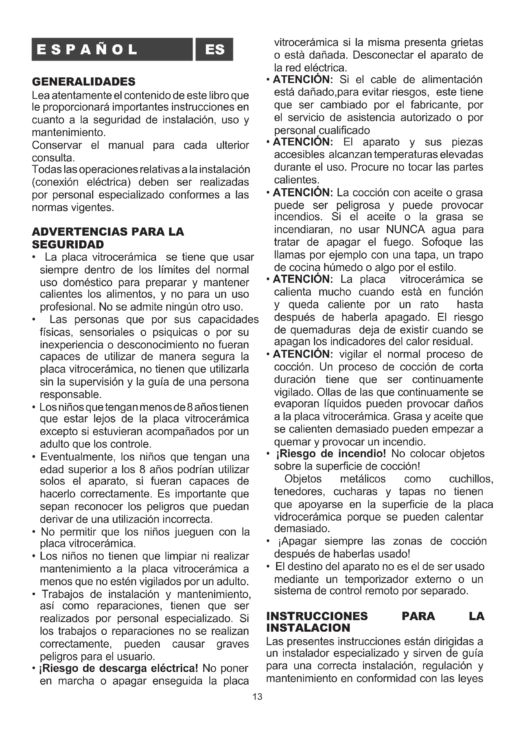 - La placa vitrocerámica se tiene que usar siempre dentro de los límites del normal uso doméstico para preparar y mantener calientes los alimentos, y no para un uso profesional. No se admite ningún otro uso.