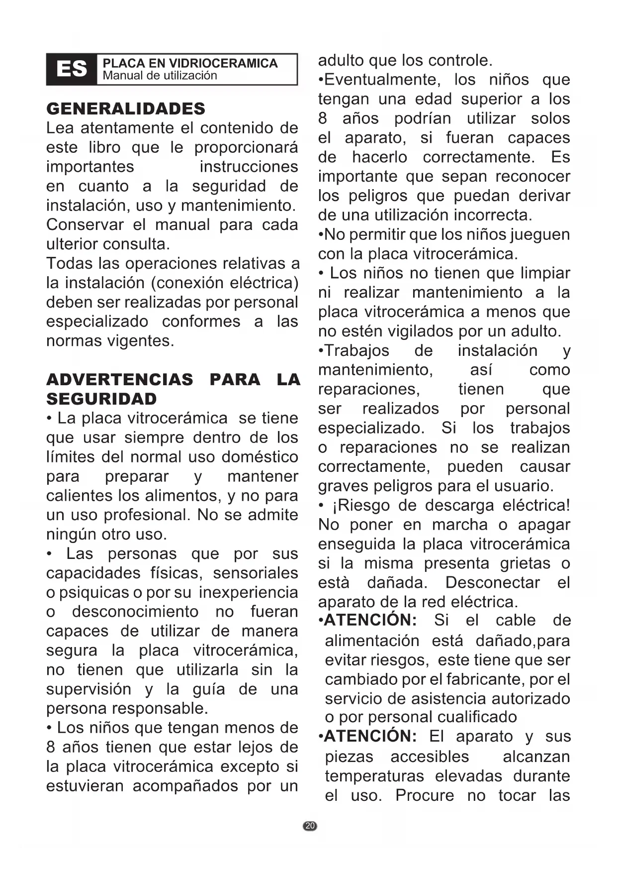 - Las personas que por sus capacidades físicas, sensoriales o psiquicas o por su inexperiencia o desconocimiento no fueran capaces de utilizar de manera segura la placa vitrocerámica, no tienen que utilizarla sin la supervisión y la guía de una persona responsable.