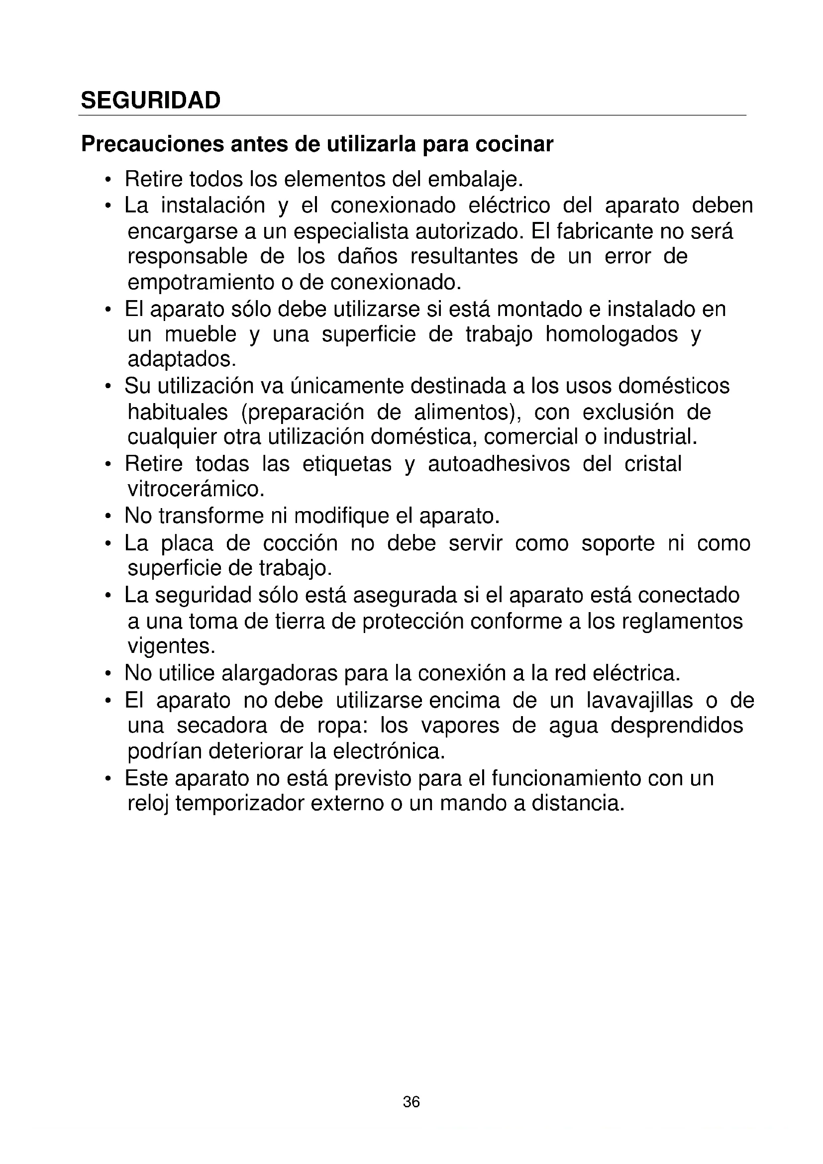 Il fabbricante declina qualsiasi responsabilità per ogni incidente risultante da connessione sbagliata dell’ap parecchio, incluso l’utilizzo di un apparecchio non correttamente messo a terra, o connesso con una messa a terra difettosa.35 Estimado/a cliente, Le agradecemos la confianza que nos ha otorgado al elegir nuestra placa de cocción vitrocerámica. Con el fin de conocer bien este aparato, le recomendamos lea atentamente estas instrucciones de utilización en su totalidad y las conserve para consultas posteriores.