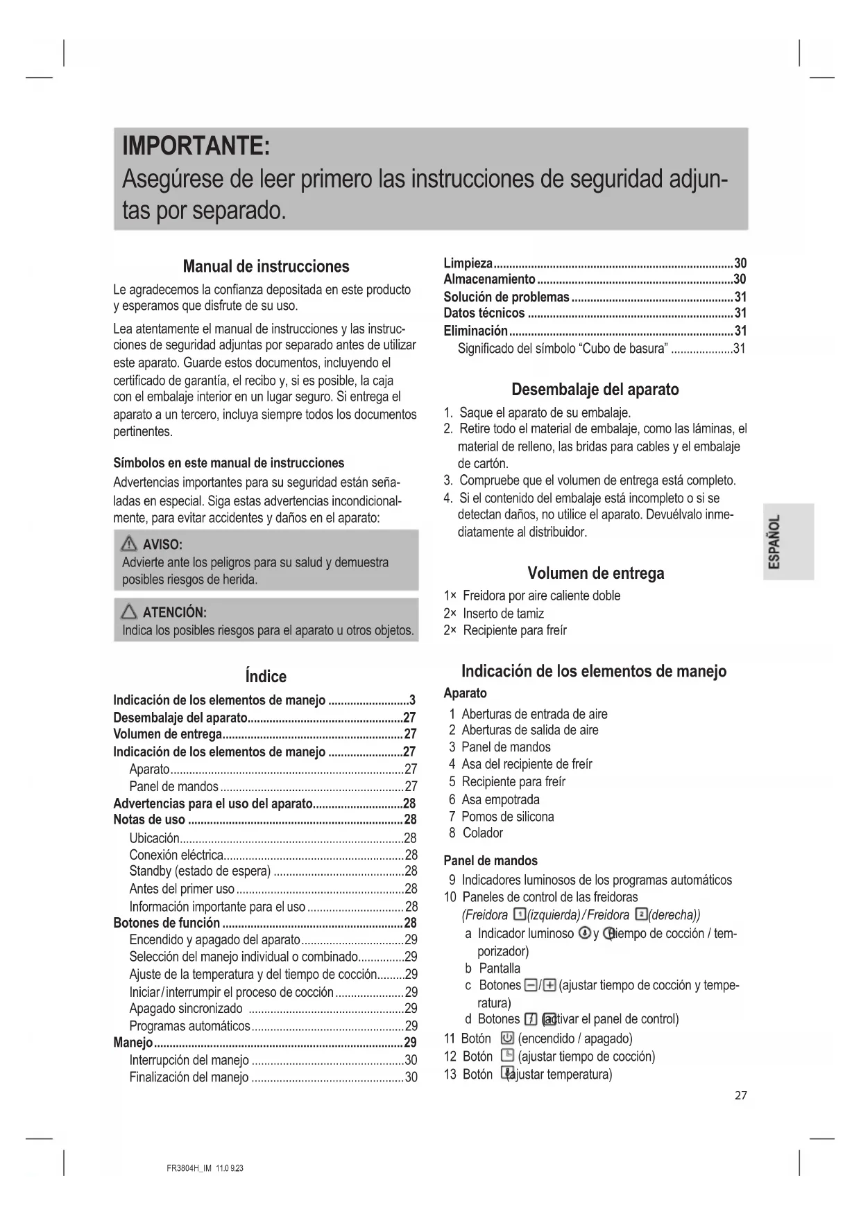 detectan daños, no utilice el aparato. Devuélvalo inme- diatamente al distribuidor. Volumen de entrega 1× Freidora por aire caliente doble 2× Inserto de tamiz 2× Recipiente para freír Indicación de los elementos de manejo Aparato 1 Aberturas de entrada de aire 2 Aberturas de salida de aire 3 Panel de mandos 4 Asa del recipiente de freír 5 Recipiente para freír 6 Asa empotrada 7 Pomos de silicona 8 Colador Panel de mandos 9 Indicadores luminosos de los programas automáticos 10 Paneles de control de las freidoras (Freidora (izquierda) / Freidora (derecha)) a Indicador luminoso y (tiempo de cocción / tem- porizador) b Pantalla c Botones / (ajustar tiempo de cocción y tempe- ratura) d Botones / (activar el panel de control) 11 Botón (encendido / apagado) 12 Botón (ajustar tiempo de cocción) 13 Botón (ajustar temperatura)FR3804H_IM 11.0 9.23