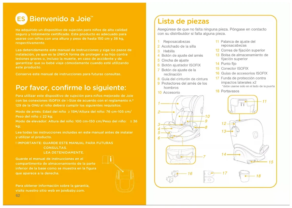 kg; Lea todas las instrucciones incluidas en este manual antes de instalar y utilizar el producto.! IMPORTANTE: GUARDE ESTE MANUAL PARA FUTURAS CONSULTAS.LEA DETENIDAMENTE.Guarde el manual de instrucciones en el compartimento de almacenamiento de la parte inferior de la base como se muestra en la figura que aparece a la derecha.Para obtener información sobre la garantía﹐ visite nuestro sitio web en joiebaby.com. Lista de piezas 1 Reposacabezas2 Acolchado de la silla3 Hebilla4 Botón de ajuste del arnés 5 Cincha de ajuste6 Botón ajustador ISOFIX7 Botón de ajuste de la reclinación8 Guía del cinturón de cintura9 Protectores del arnés de los hombros10 Accesorio11 Palanca de ajuste del reposacabezas12 Correa de fijación superior13 Bolsa de almacenamiento de fijación superior14 Punto fijo15 Conector ISOFIX16 Guías de accesorios ISOFIX17 Funda de protección contra impactos laterales x2*debe usarse solo en el lado de la puerta18 PortavasosAsegúrese de que no falta ninguna pieza. Póngase en contacto con su distribuidor si falta alguna pieza.