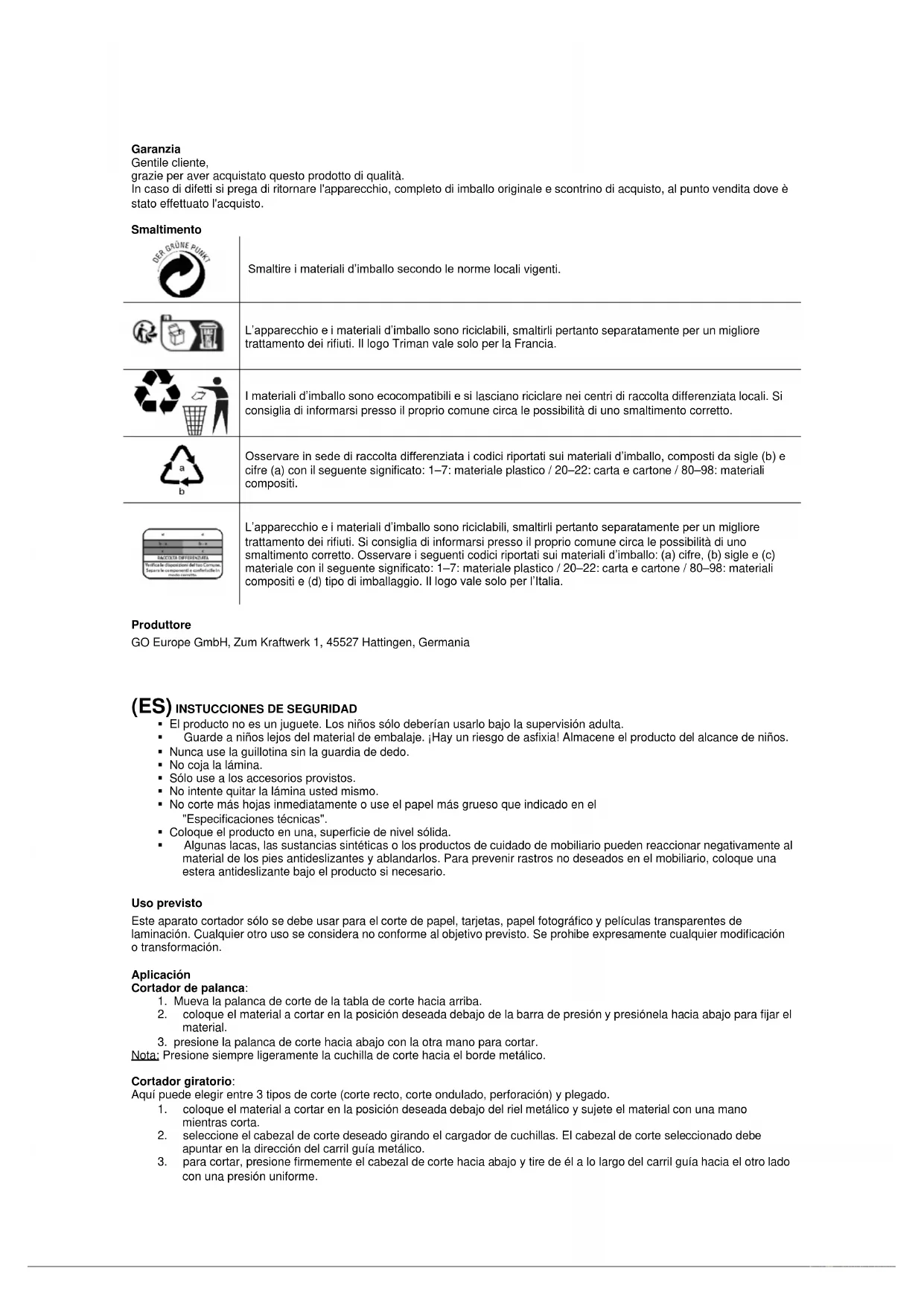 apuntar en la dirección del carril guía metálico. 3. para cortar, presione firmemente el cabezal de corte hacia abajo y tire de él a lo largo del carril guía hacia el otro lado con una presión uniforme.Limpieza Limpie la unidad con un paño ligeramente humedecido. No utilice productos de limpieza agresivos ni productos químicos. Datos técnicos Modelo: GENIE GT 06 Combo Materiales a cortar: papel, tarjetas y fotos Longitud de corte: Cortadora de palanca: 320 mm Cortador de rollo: 310 mm Capacidad de corte: Cortadora de palanca: Máx. 6 hojas Cortador de rollo: Máx. 5 hojas Cortador de eje: máx. 3 hojas Dimensiones (LxAxA): 418 x 210 x 62 mm Garantía Estimado cliente: Nos alegramos de que usted se haya decidido por este aparato. En caso de un defecto devuelva el aparato junto con el justificante de compra y el embalaje original al lugar donde lo ha adquirido. Eliminación