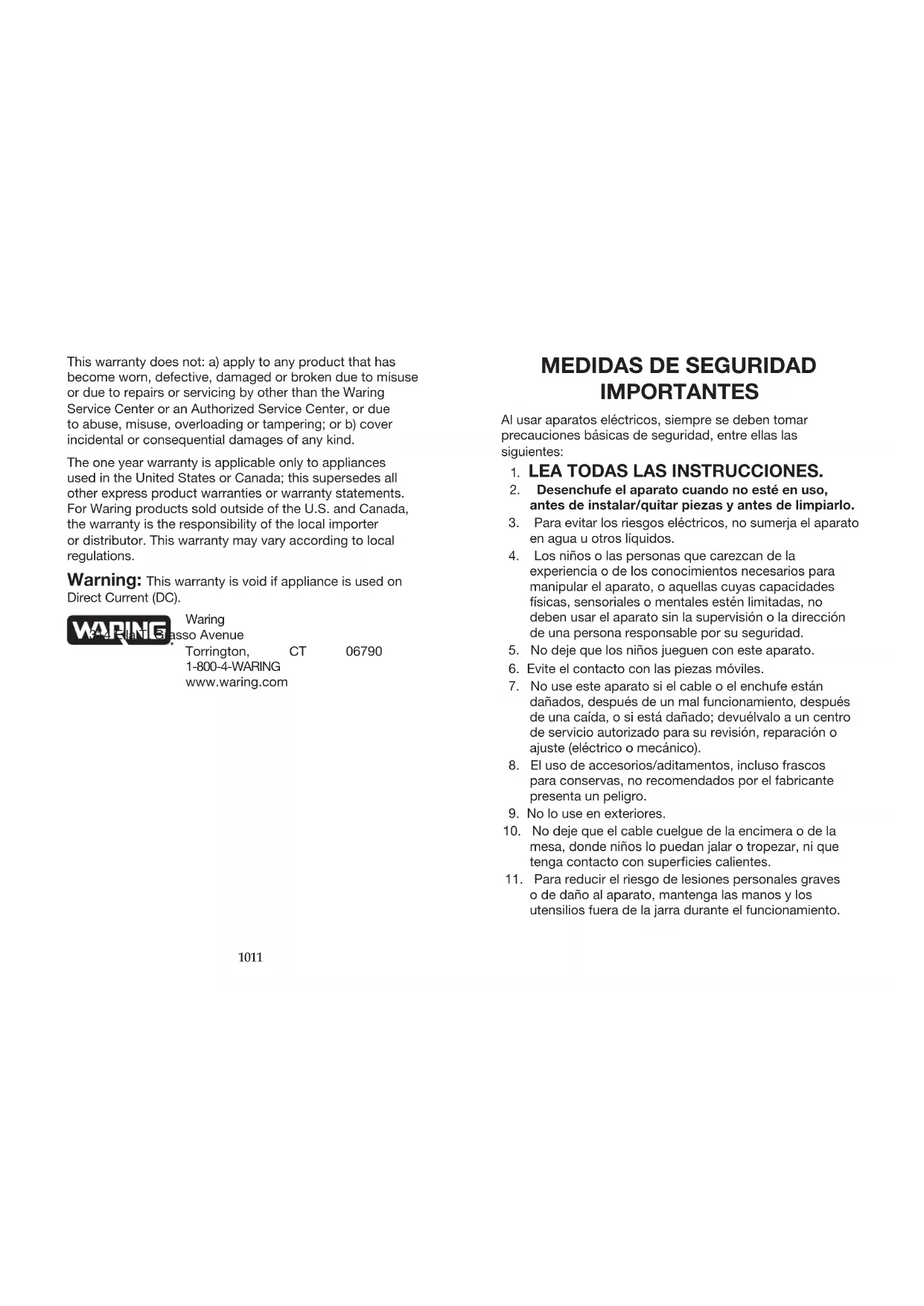 limpiadora.18 19 Bajo esta garantía, Waring reparará o reemplazará toda pieza que, tras estar inspeccionada por nuestro servicio de atención al cliente, demuestre defectos de fabricación o fallas de materiales, siempre que el producto se entregue con franqueo pagado a: Waring Service Center, 314 Ella T. Grasso Ave., Torrington, CT 06790, o a cualquier servicio postventa aprobado. Esta garantía: a) no se aplica a ningún producto desgastado, defectuoso, dañado o roto debido a uso, reparaciones/ servicio realizados por personas no autorizadas, o abuso, mal uso, sobrecarga o daños intencionales; b) no cubre daños incidentales o consecuentes de ningún tipo. Esta garantía es válida solamente para los aparatos comprados en los Estados Unidos y Canadá y reemplaza todas las demás declaraciones expresas de garantía. La garantía de los productos Waring adquiridos fuera de los Estados Unidos y del Canadá es la responsabilidad del importador/distribuidor local. Los derechos de garantía pueden variar según las regulaciones locales. Advertencia: Usar este aparato con corriente continua (C.C./DC) invalidará la garantía. Waring 314 Ella T. Grasso Avenue Torrington, CT 06790