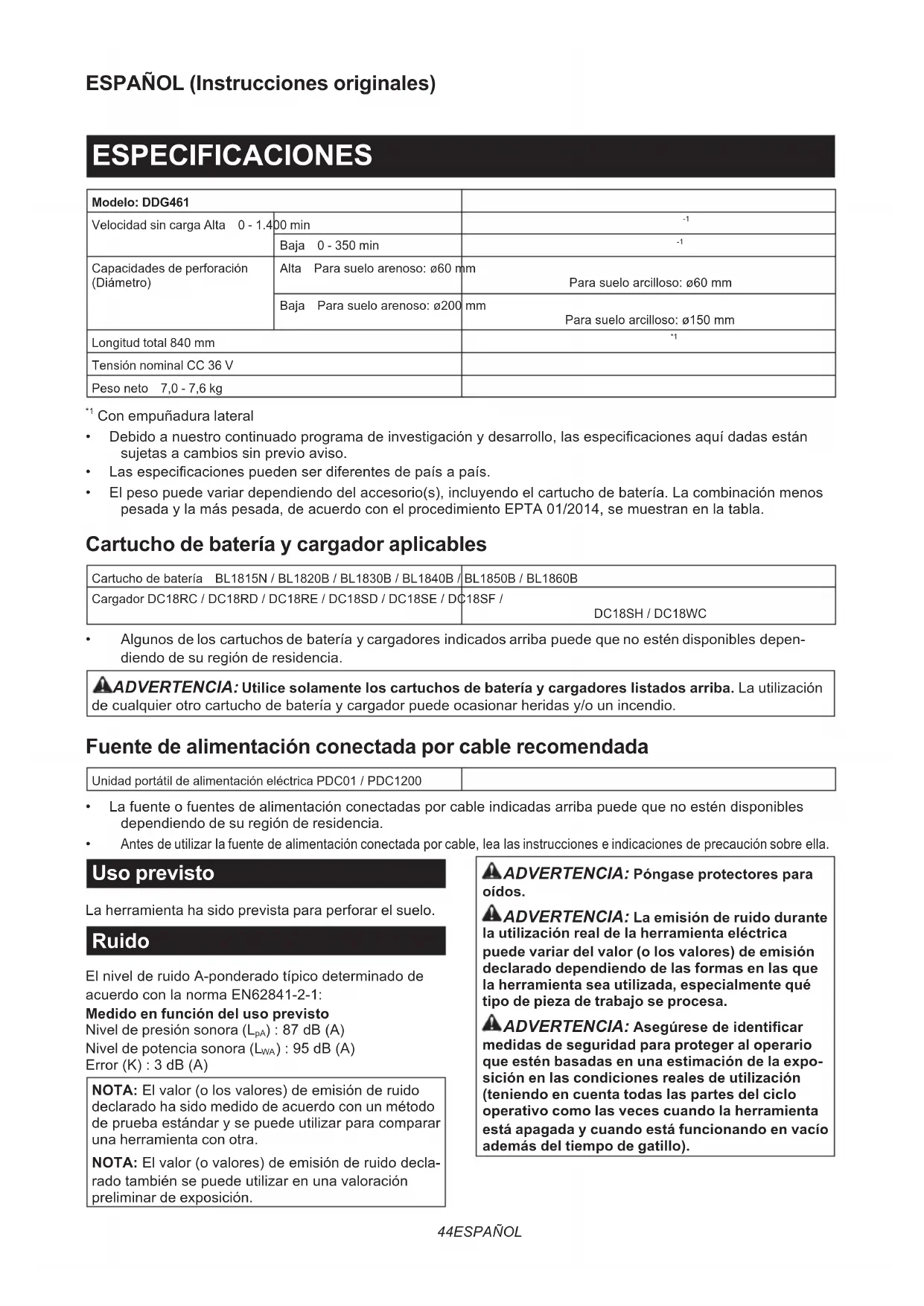 Antesdeutilizarlafuentedealimentaciónconectadaporcable,lealasinstruccioneseindicacionesdeprecauciónsobreella. Uso previsto La herramienta ha sido prevista para perforar el suelo. Ruido ElnivelderuidoA-ponderadotípicodeterminadode acuerdoconlanormaEN62841-2-1: Medido en función del uso previsto Nivel de presión sonora (L