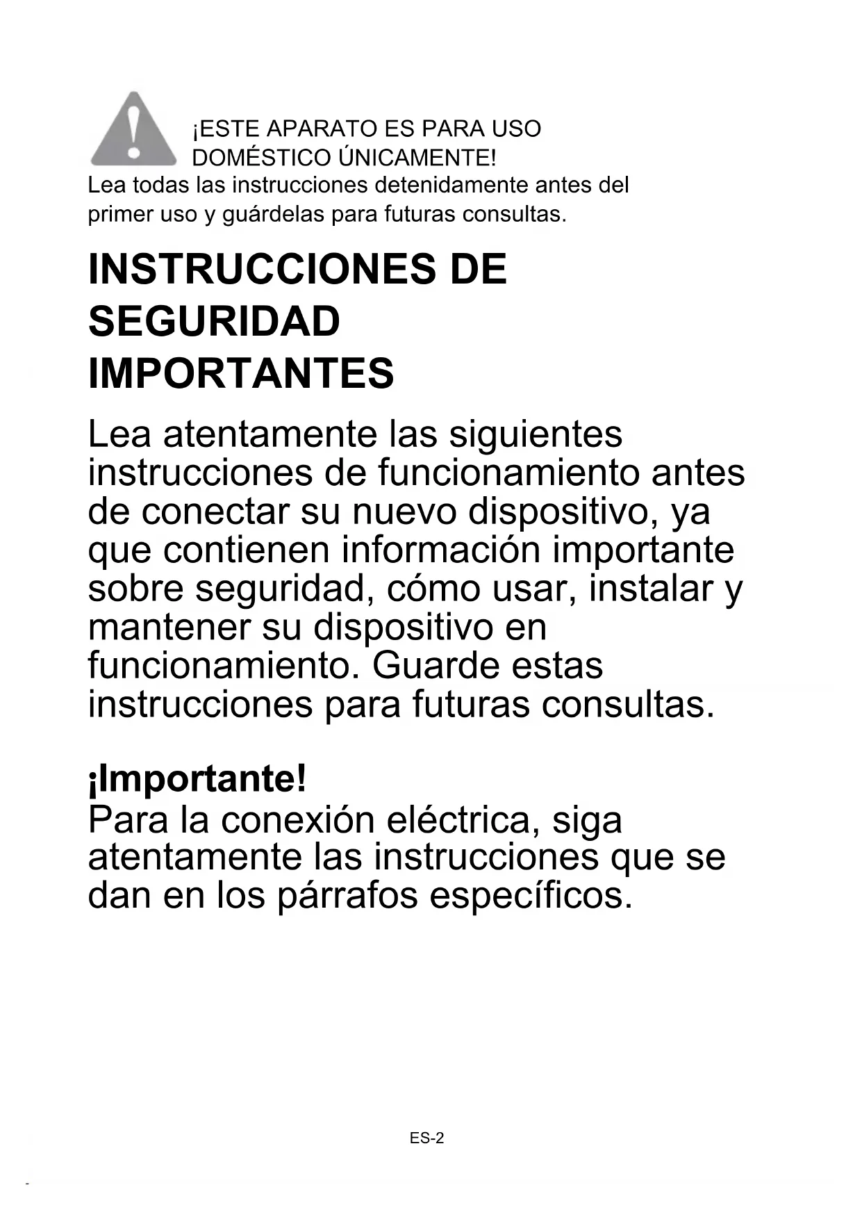 DOMÉSTICO ÚNICAMENTE! Lea todas las instrucciones detenidamente antes del primer uso y guárdelas para futuras consultas. INSTRUCCIONES DE SEGURIDAD IMPORTANTES Lea atentamente las siguientes instrucciones de funcionamiento antes de conectar su nuevo dispositivo, ya que contienen información importante sobre seguridad, cómo usar, instalar y mantener su dispositivo en funcionamiento. Guarde estas instrucciones para futuras consultas. ¡Importante! Para la conexión eléctrica, siga atentamente las instrucciones que se dan en los párrafos específicos. ES-21. Este dispositivo puede ser utilizado por niños a partir de 8 años y por personas con capacidades físicas, sensoriales o mentales reducidas o con falta de experiencia y conocimiento, siempre que hayan sido puestos bajo supervisión o hayan recibido instrucciones sobre cómo utilizar el aparato de forma segura y que comprender los peligros involucrados. Los niños no deben jugar con el dispositivo. Los niños no deben realizar la limpieza y el mantenimiento del usuario sin supervisión.