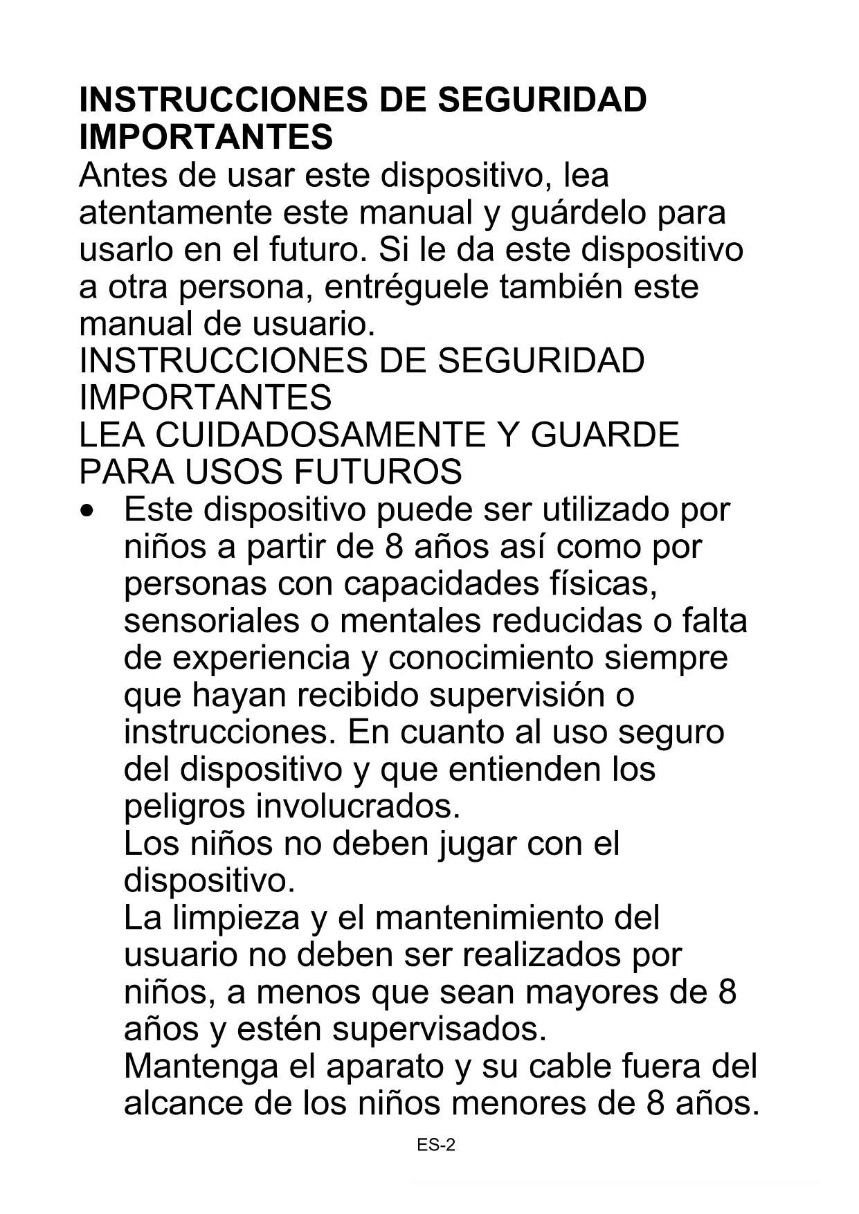 Este dispositivo puede ser utilizado por niños a partir de 8 años así como por personas con capacidades físicas, sensoriales o mentales reducidas o falta de experiencia y conocimiento siempre que hayan recibido supervisión o instrucciones. En cuanto al uso seguro del dispositivo y que entienden los peligros involucrados. Los niños no deben jugar con el dispositivo. La limpieza y el mantenimiento del usuario no deben ser realizados por niños, a menos que sean mayores de 8 años y estén supervisados. Mantenga el aparato y su cable fuera del alcance de los niños menores de 8 años.ES-3
