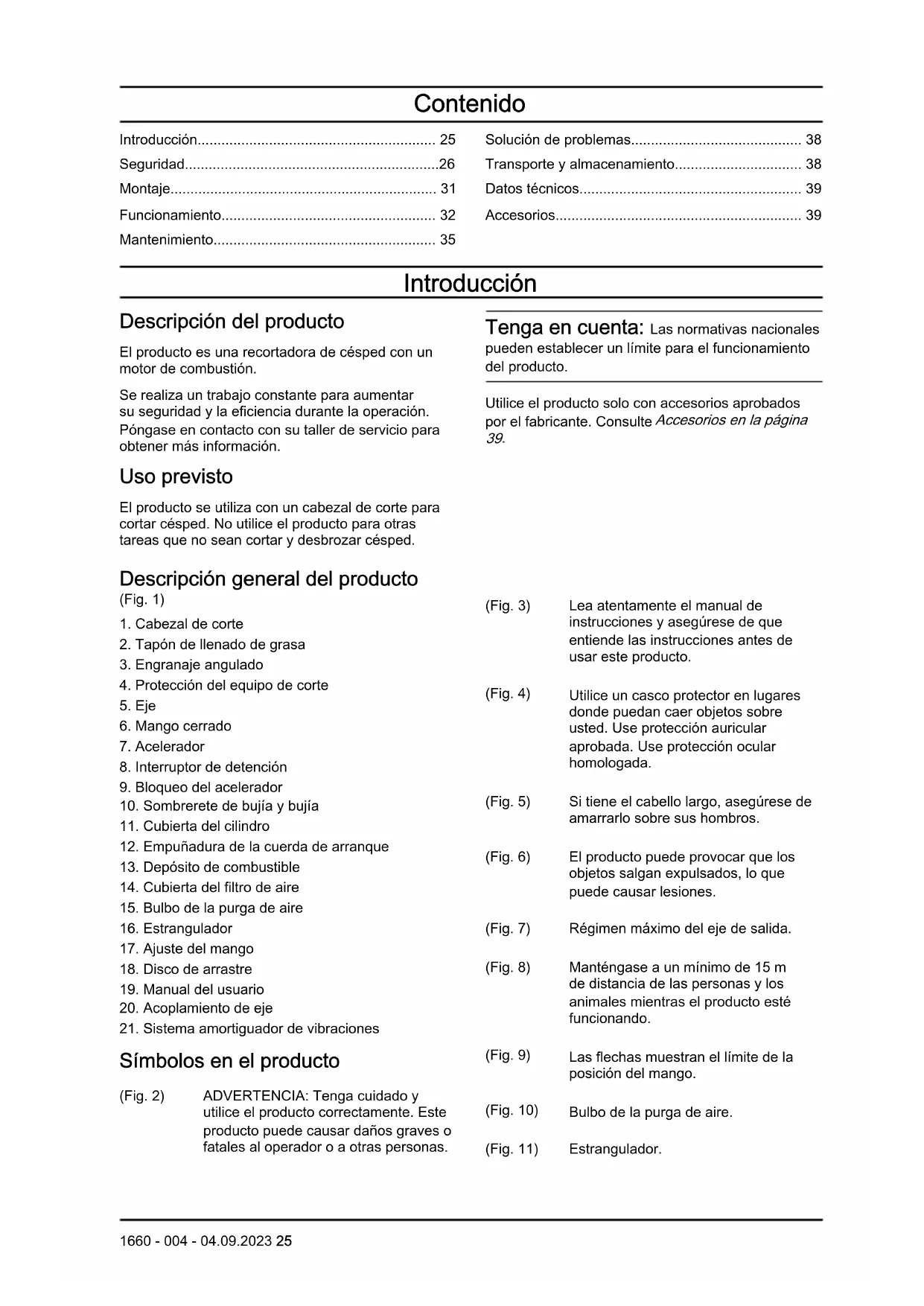 - Una desbrozadora, un quita arbustos o una recortadora pueden resultar peligrosos si se utilizan de manera inapropiada o incorrecta, ya que pueden causar daños graves o fatales al operador u otras personas. Es muy importante que lea y comprenda el contenido de este manual de usuario.