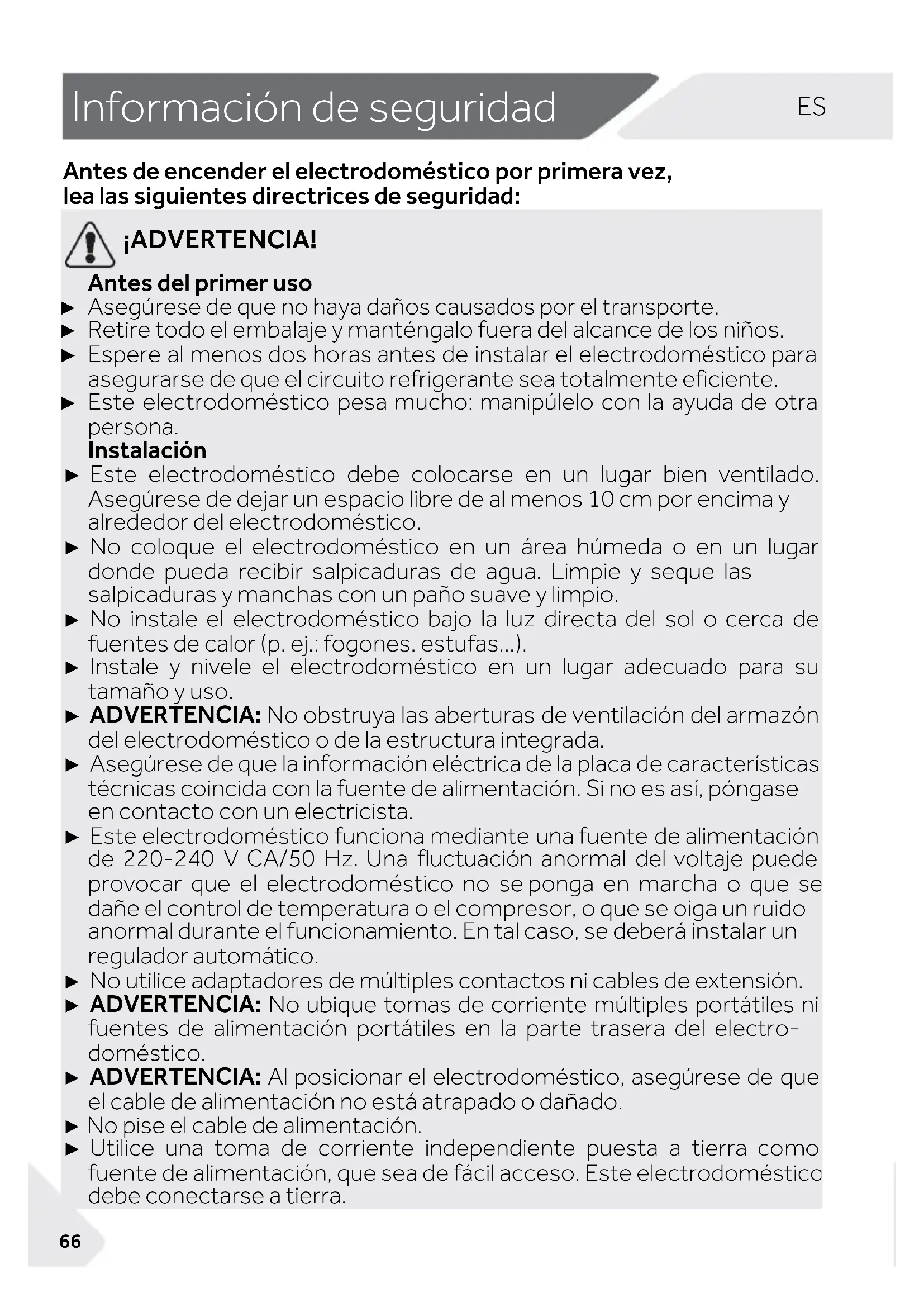 ¡ADVERTENCIA! Antes del primer uso ► Asegúrese de que no haya daños causados por el transporte. ► Retire todo el embalaje y manténgalo fuera del alcance de los niños. ► Espere al menos dos horas antes de instalar el electrodoméstico para asegurarse de que el circuito refrigerante sea totalmente eficiente. ► Este electrodoméstico pesa mucho: manipúlelo con la ayuda de otra persona. Instalación ► Este electrodoméstico debe colocarse en un lugar bien ventilado. Asegúrese de dejar un espacio libre de al menos 10 cm por encima y alrededor del electrodoméstico. ► No coloque el electrodoméstico en un área húmeda o en un lugar donde pueda recibir salpicaduras de agua. Limpie y seque las salpicaduras y manchas con un paño suave y limpio. ► No instale el electrodoméstico bajo la luz directa del sol o cerca de fuentes de calor (p. ej.: fogones, estufas...). ► Instale y nivele el electrodoméstico en un lugar adecuado para su tamaño y uso. ► ADVERTENCIA: No obstruya las aberturas de ventilación del armazón del electrodoméstico o de la estructura integrada. ► Asegúrese de que la información eléctrica de la placa de características técnicas coincida con la fuente de alimentación. Si no es así, póngase en contacto con un electricista. ► Este electrodoméstico funciona mediante una fuente de alimentación de 220-240 V CA/50 Hz. Una fluctuación anormal del voltaje puede provocar que el electrodoméstico no se ponga en marcha o que se dañe el control de temperatura o el compresor, o que se oiga un ruido anormal durante el funcionamiento. En tal caso, se deberá instalar un regulador automático. ► No utilice adaptadores de múltiples contactos ni cables de extensión. ► ADVERTENCIA: No ubique tomas de corriente múltiples portátiles ni fuentes de alimentación portátiles en la parte trasera del electro- doméstico. ► ADVERTENCIA: Al posicionar el electrodoméstico, asegúrese de que el cable de alimentación no está atrapado o dañado. ► No pise el cable de alimentación. ► Utilice una toma de corriente independiente puesta a tierra como fuente de alimentación, que sea de fácil acceso. Este electrodoméstico debe conectarse a tierra.ES Información de seguridad
