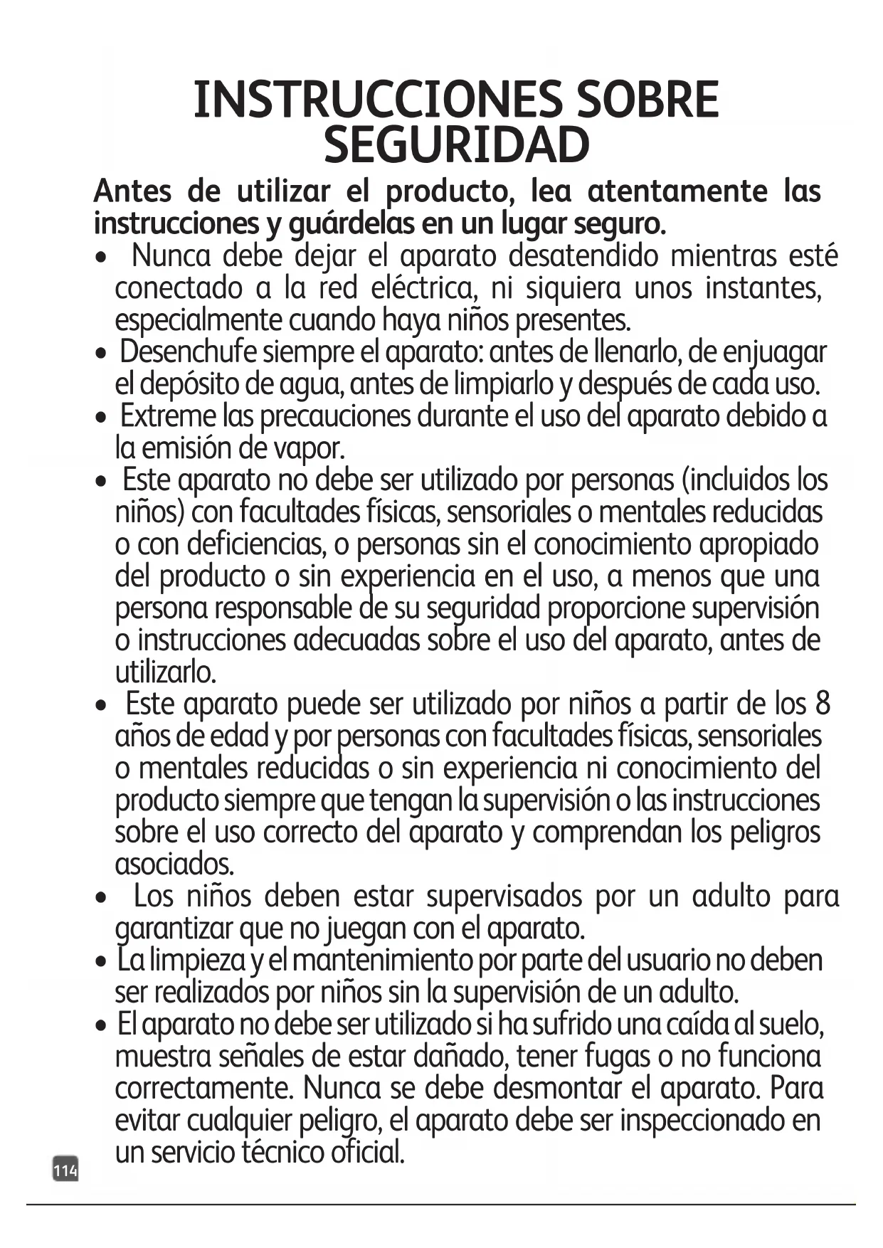 - Este aparato no debe ser utilizado por personas (incluidos los niños) con facultades físicas, sensoriales o mentales reducidas o con deficiencias, o personas sin el conocimiento apropiado del producto o sin experiencia en el uso, a menos que una persona responsable de su seguridad proporcione supervisión o instrucciones adecuadas sobre el uso del aparato, antes de utilizarlo.