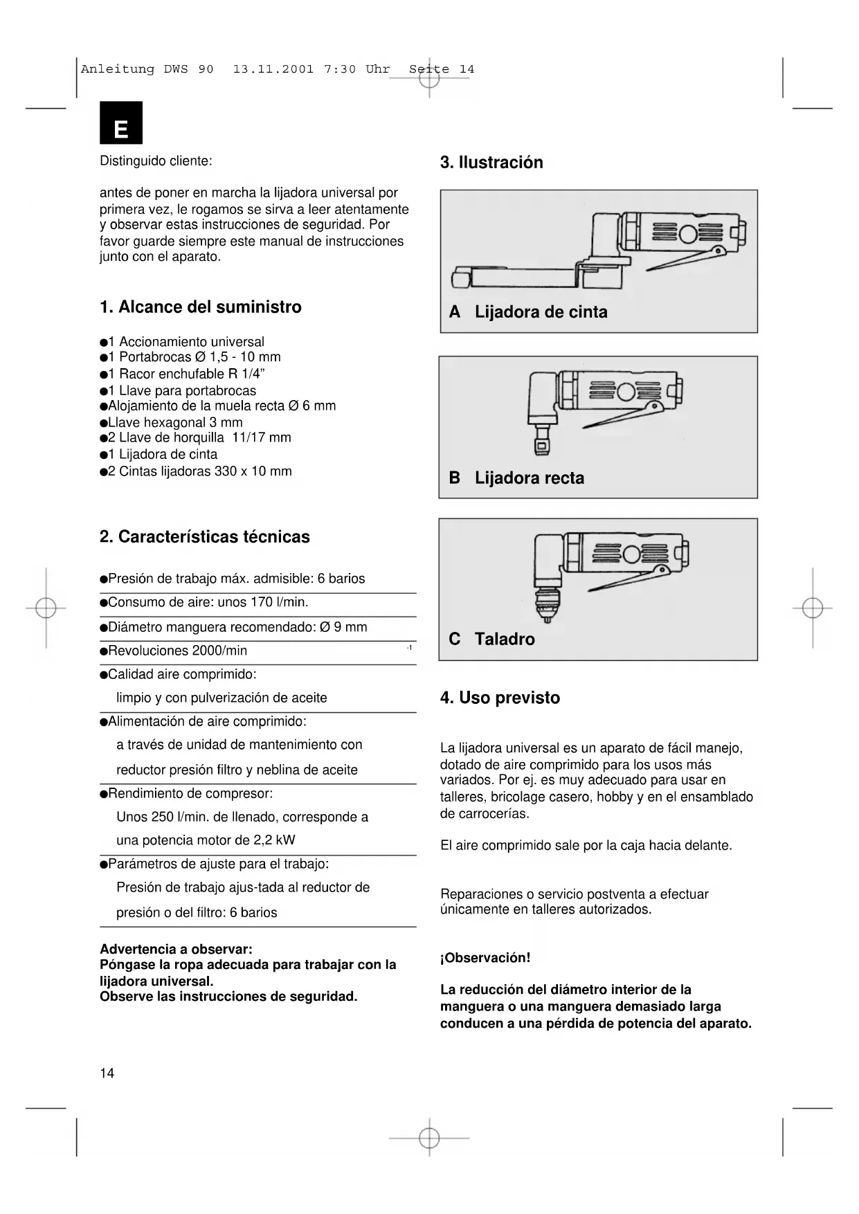 Stiftslijper Boormachine Anleitung DWS 90 13.11.2001 7:30 Uhr Seite 13Distinguido cliente: antes de poner en marcha la lijadora universal por primera vez, le rogamos se sirva a leer atentamente y observar estas instrucciones de seguridad. Por favor guarde siempre este manual de instrucciones junto con el aparato.