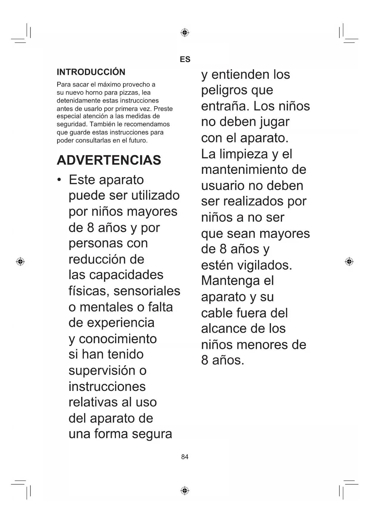 - Este aparato puede ser utilizado por niños mayores de 8 años y por personas con reducción de las capacidades físicas, sensoriales o mentales o falta de experiencia y conocimiento si han tenido supervisión o instrucciones relativas al uso del aparato de una forma segura y entienden los peligros que entraña. Los niños no deben jugar con el aparato. La limpieza y el mantenimiento de usuario no deben ser realizados por niños a no ser que sean mayores de 8 años y estén vigilados. Mantenga el aparato y su cable fuera del alcance de los niños menores de 8 años.85