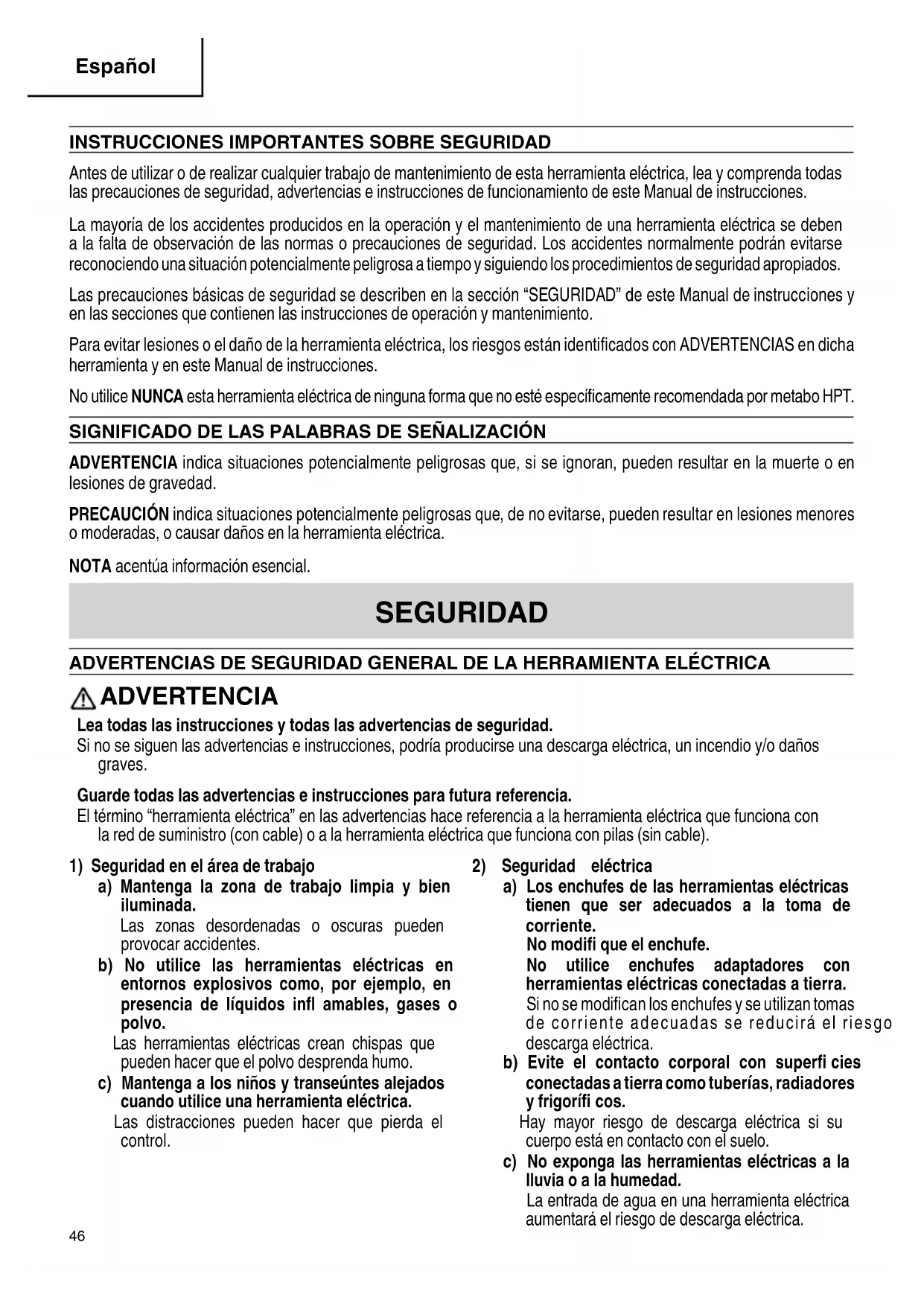 Français 00BookRH18DAmetabo.indb4500BookRH18DAmetabo.indb45 2022/01/2611:10:262022/01/2611:10:26INSTRUCCIONES IMPORTANTES SOBRE SEGURIDAD Antes de utilizar o de realizar cualquier trabajo de mantenimiento de esta herramienta eléctrica, lea y comprenda todas las precauciones de seguridad, advertencias e instrucciones de funcionamiento de este Manual de instrucciones. La mayoría de los accidentes producidos en la operación y el mantenimiento de una herramienta eléctrica se deben a la falta de observación de las normas o precauciones de seguridad. Los accidentes normalmente podrán evitarse reconociendo una situación potencialmente peligrosa a tiempo y siguiendo los procedimientos de seguridad apropiados. Las precauciones básicas de seguridad se describen en la sección “SEGURIDAD” de este Manual de instrucciones y en las secciones que contienen las instrucciones de operación y mantenimiento. Para evitar lesiones o el daño de la herramienta eléctrica, los riesgos están identifi cados con ADVERTENCIAS en dicha herramienta y en este Manual de instrucciones. No utilice NUNCA esta herramienta eléctrica de ninguna forma que no esté específi camente recomendada por metabo HPT. SIGNIFICADO DE LAS PALABRAS DE SEÑALIZACIÓN ADVERTENCIA indica situaciones potencialmente peligrosas que, si se ignoran, pueden resultar en la muerte o en lesiones de gravedad. PRECAUCIÓN indica situaciones potencialmente peligrosas que, de no evitarse, pueden resultar en lesiones menores o moderadas, o causar daños en la herramienta eléctrica. NOTA acentúa información esencial. SEGURIDAD ADVERTENCIAS DE SEGURIDAD GENERAL DE LA HERRAMIENTA ELÉCTRICA ADVERTENCIA Lea todas las instrucciones y todas las advertencias de seguridad. Si no se siguen las advertencias e instrucciones, podría producirse una descarga eléctrica, un incendio y/o daños graves. Guarde todas las advertencias e instrucciones para futura referencia. El término “herramienta eléctrica” en las advertencias hace referencia a la herramienta eléctrica que funciona con la red de suministro (con cable) o a la herramienta eléctrica que funciona con pilas (sin cable).