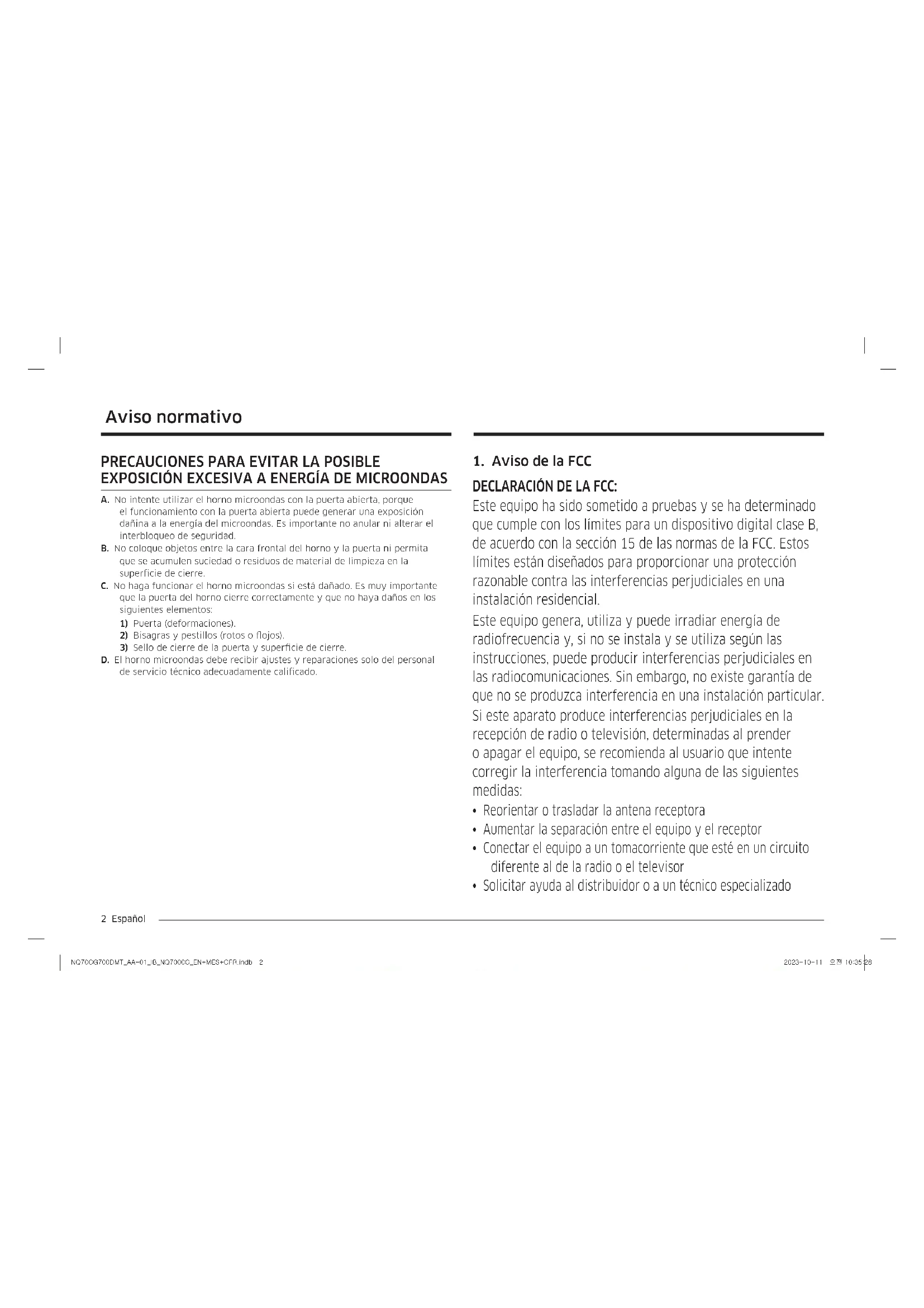 D. El horno microondas debe recibir ajustes y reparaciones solo del personal de servicio técnico adecuadamente calicado. NQ70CG700DMT_AA-01_IB_NQ7000C_EN+MES+CFR.indb 2NQ70CG700DMT_AA-01_IB_NQ7000C_EN+MES+CFR.indb 2 2023-10-11 오전 10:35:282023-10-11 오전 10:35:28Español 3 Aviso normativo DECLARACIÓN DE IC SOBRE LA EXPOSICIÓN A LA RADIACIÓN: Este equipo cumple con los límites de exposición a la radiación IC RSS-102 establecidos para un entorno no controlado. Este equipo debe instalarse y usarse de manera que haya al menos 8 in (20 cm) entre el radiador y el cuerpo. El dispositivo y las antenas no deben estar ubicados ni funcionar junto con ninguna otra antena o transmisor. DECLARACIÓN DE LA FCC SOBRE LA EXPOSICIÓN A LA RADIACIÓN: Este equipo cumple con los límites de exposición a la radiación de la FCC establecidos para un entorno no controlado. Este equipo debe instalarse y usarse de manera que haya al menos 8 in (20 cm) entre el radiador y el cuerpo. El dispositivo y las antenas no deben estar ubicados ni funcionar junto con ninguna otra antena o transmisor.