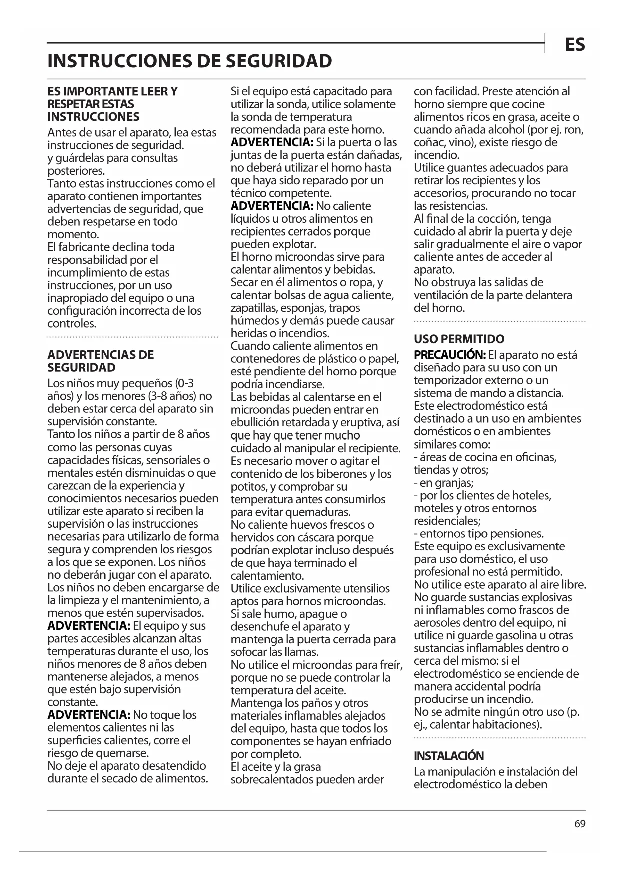 RESPETAR ESTAS INSTRUCCIONES Antes de usar el aparato, lea estas instrucciones de seguridad. y guárdelas para consultas posteriores. Tanto estas instrucciones como el aparato contienen importantes advertencias de seguridad, que deben respetarse en todo momento. El fabricante declina toda responsabilidad por el incumplimiento de estas instrucciones, por un uso inapropiado del equipo o una configuración incorrecta de los controles. ADVERTENCIAS DE SEGURIDAD Los niños muy pequeños (0-3 años) y los menores (3-8 años) no deben estar cerca del aparato sin supervisión constante. Tanto los niños a partir de 8 años como las personas cuyas capacidades físicas, sensoriales o mentales estén disminuidas o que carezcan de la experiencia y conocimientos necesarios pueden utilizar este aparato si reciben la supervisión o las instrucciones necesarias para utilizarlo de forma segura y comprenden los riesgos a los que se exponen. Los niños no deberán jugar con el aparato. Los niños no deben encargarse de la limpieza y el mantenimiento, a menos que estén supervisados. ADVERTENCIA: El equipo y sus partes accesibles alcanzan altas temperaturas durante el uso, los niños menores de 8 años deben mantenerse alejados, a menos que estén bajo supervisión constante. ADVERTENCIA: No toque los elementos calientes ni las superficies calientes, corre el riesgo de quemarse. No deje el aparato desatendido durante el secado de alimentos. Si el equipo está capacitado para utilizar la sonda, utilice solamente la sonda de temperatura recomendada para este horno. ADVERTENCIA: Si la puerta o las juntas de la puerta están dañadas, no deberá utilizar el horno hasta que haya sido reparado por un técnico competente. ADVERTENCIA: No caliente líquidos u otros alimentos en recipientes cerrados porque pueden explotar. El horno microondas sirve para calentar alimentos y bebidas. Secar en él alimentos o ropa, y calentar bolsas de agua caliente, zapatillas, esponjas, trapos húmedos y demás puede causar heridas o incendios. Cuando caliente alimentos en contenedores de plástico o papel, esté pendiente del horno porque podría incendiarse. Las bebidas al calentarse en el microondas pueden entrar en ebullición retardada y eruptiva, así que hay que tener mucho cuidado al manipular el recipiente. Es necesario mover o agitar el contenido de los biberones y los potitos, y comprobar su temperatura antes consumirlos para evitar quemaduras. No caliente huevos frescos o hervidos con cáscara porque podrían explotar incluso después de que haya terminado el calentamiento. Utilice exclusivamente utensilios aptos para hornos microondas. Si sale humo, apague o desenchufe el aparato y mantenga la puerta cerrada para sofocar las llamas. No utilice el microondas para freír, porque no se puede controlar la temperatura del aceite. Mantenga los paños y otros materiales inflamables alejados del equipo, hasta que todos los componentes se hayan enfriado por completo. El aceite y la grasa sobrecalentados pueden arder con facilidad. Preste atención al horno siempre que cocine alimentos ricos en grasa, aceite o cuando añada alcohol (por ej. ron, coñac, vino), existe riesgo de incendio. Utilice guantes adecuados para retirar los recipientes y los accesorios, procurando no tocar las resistencias. Al final de la cocción, tenga cuidado al abrir la puerta y deje salir gradualmente el aire o vapor caliente antes de acceder al aparato. No obstruya las salidas de ventilación de la parte delantera del horno. USO PERMITIDO PRECAUCIÓN: El aparato no está diseñado para su uso con un temporizador externo o un sistema de mando a distancia. Este electrodoméstico está destinado a un uso en ambientes domésticos o en ambientes similares como: - áreas de cocina en oficinas, tiendas y otros; - en granjas; - por los clientes de hoteles, moteles y otros entornos residenciales; - entornos tipo pensiones. Este equipo es exclusivamente para uso doméstico, el uso profesional no está permitido. No utilice este aparato al aire libre. No guarde sustancias explosivas ni inflamables como frascos de aerosoles dentro del equipo, ni utilice ni guarde gasolina u otras sustancias inflamables dentro o cerca del mismo: si el electrodoméstico se enciende de manera accidental podría producirse un incendio. No se admite ningún otro uso (p. ej., calentar habitaciones). INSTALACIÓN La manipulación e instalación del electrodoméstico la deben70 realizar dos o más personas. Utilice guantes de protección para desembalar e instalar el equipo. Este aparato ha sido diseñado para usarlo empotrado. No lo use sin fijarlo. La instalación y las reparaciones debe realizarlas un técnico cualificado, según las instrucciones del fabricante y de conformidad con la normativa local. No realice reparaciones ni sustituya piezas del aparato a menos que así se indique específicamente en el manual del usuario. Los niños no deben llevar a cabo el proceso de instalación. Mantenga a los niños alejados durante la instalación. Mantenga todos los materiales de embalaje (bolsas de plástico, piezas de poliestireno, etc.) fuera del alcance de los niños durante y después de instalar el aparato. Tras desembalar el aparato, compruebe que no ha sufrido daños durante el transporte. Si observa algún problema, póngase en contacto con el distribuidor o con el Servicio Postventa más cercano. El electrodoméstico debe desconectarse de la red eléctrica antes de efectuar cualquier operación de instalación. Durante la instalación, compruebe que el electrodoméstico no provoca daños en el cable de alimentación. No active el aparato hasta haberlo instalado por completo. Después de la instalación, la base del aparato no debe ser accesible. Realice todas las tareas de corte del armario antes de instalar el aparato en el alojamiento y retire por completo todas las virutas de madera y el serrín. No obstruya el espacio mínimo entre la encimera y el borde superior del horno. No