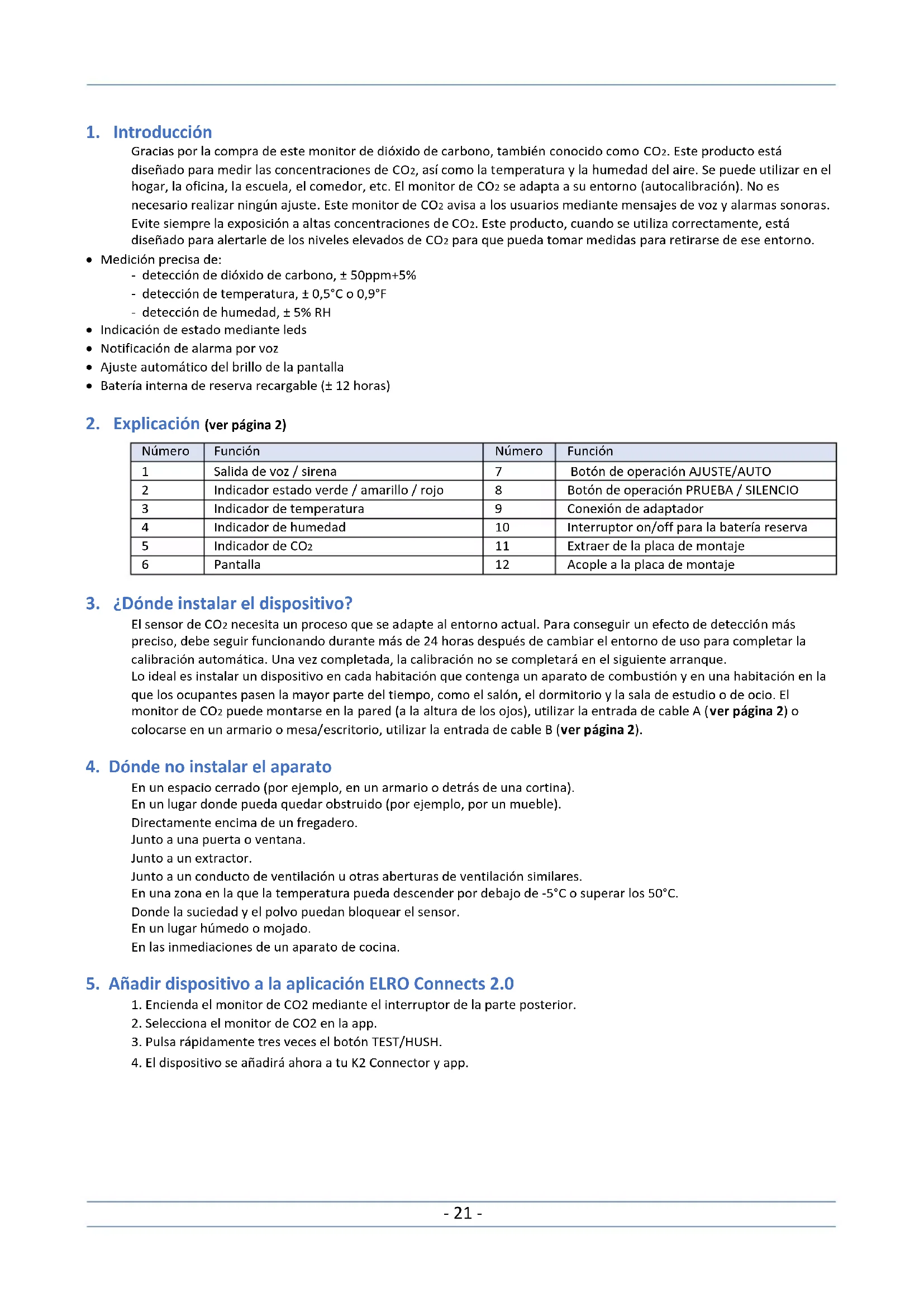 Este monitor de CO2 está diseñado para alertarle de una acumulación potencialmente peligrosa de gas de dióxido de carbono. No está diseñado para remediar un problema de Dióxido de Carbono ni para localizar una fuente específica de Dióxido de Carbono. ELRO no será responsable de pagar ninguna investigación de Dióxido de Carbono o llamada de servicio llevada a cabo u organizada en respuesta a una alarma. ACCESORIO - SF50GA SMART HOME ALARM K2 CONNECTOR Su enlace con la aplicación ELRO Connects. El Conector K2 adopta la tecnología de radiofrecuencia (RF) que tiene las características de bajo consumo de energía de alta seguridad y las comunicaciones avanzadas entre los dispositivos de RF y permite formar un sistema inteligente con nuestros otros productos de RF, tales como: Alarmas de humo, alarmas de monóxido de carbono, monitores de CO2, alarmas de calor y agua, sensores de puertas y ventanas, sensores de movimiento, enchufes, etc.