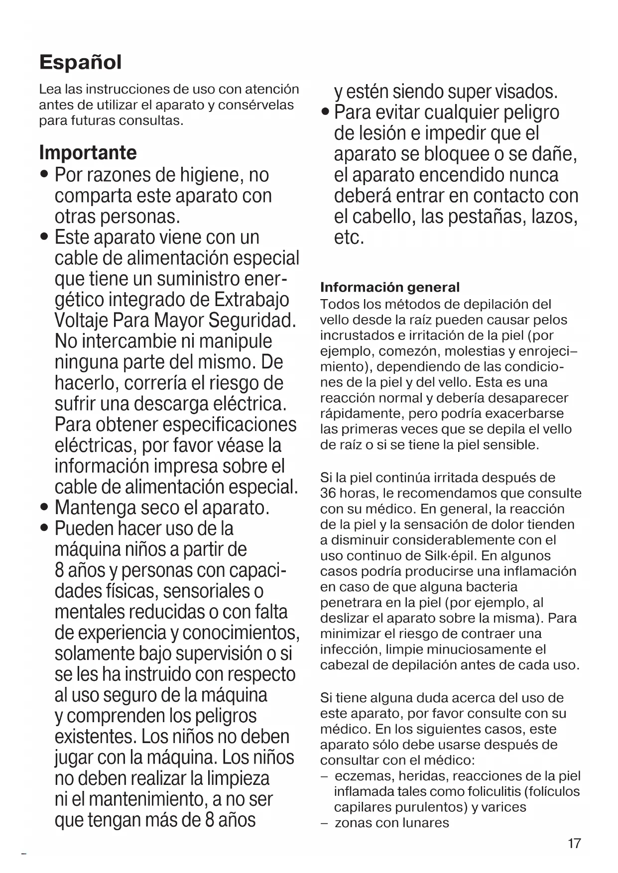 Para evitar cualquier peligro de lesión e impedir que el aparato se bloquee o se dañe, el aparato encendido nunca deberá entrar en contacto con el cabello, las pestañas, lazos, etc. Información general Todos los métodos de depilación del vello desde la raíz pueden causar pelos incrustados e irritación de la piel (por ejemplo, comezón, molestias y enrojeci– miento), dependiendo de las condicio- nes de la piel y del vello. Esta es una reacción normal y debería desaparecer rápidamente, pero podría exacerbarse las primeras veces que se depila el vello de raíz o si se tiene la piel sensible. Si la piel continúa irritada después de 36 horas, le recomendamos que consulte con su médico. En general, la reacción de la piel y la sensación de dolor tienden a disminuir considerablemente con el uso continuo de Silk·épil. En algunos casos podría producirse una inflamación en caso de que alguna bacteria penetrara en la piel (por ejemplo, al deslizar el aparato sobre la misma). Para minimizar el riesgo de contraer una infección, limpie minuciosamente el cabezal de depilación antes de cada uso. Si tiene alguna duda acerca del uso de este aparato, por favor consulte con su médico. En los siguientes casos, este aparato sólo debe usarse después de consultar con el médico: – eczemas, heridas, reacciones de la piel inflamada tales como foliculitis (folículos capilares purulentos) y varices – zonas con lunares 91618385_SE_3273_3274_GROCERY_S6-60.indd 1791618385_SE_3273_3274_GROCERY_S6-60.indd 17 22.08.17 08:3022.08.17 08:30 CSS APPROVED Effective Date 25Aug2017 GMT - Printed 22Nov2017 Page 17 of 6018 – inmunidad reducida de la piel, por ejemplo, diabetes mellitus, durante el embarazo o enfermedad de Raynaud – hemofilia o inmunodeficiencia. La depilación es más fácil y cómoda cuando el vello tiene el largo óptimo de 2 a 5 mm. Si el vello está más largo, recomendamos que lo rasure primero (véase el apartado B) y que se depile una semana más tarde cuando vuelva a salir y el vello esté más corto. El vello fino, al volver a salir, puede que no alcance la superficie de la piel. El uso habitual de esponjas de masaje (por ejemplo, tras la ducha) o peelings exfo- liantes, ayudarán a prevenir los pelos incrustados, ya que esta suave acción elimina la capa superior de la piel para que el vello pueda llegar a la superficie. Descripción 1 Rodillos masajeadores 2 Cabezal de depilación con pinzas 3 Botones de liberación del cabezal 4 Botón de encendido/apagado con luz incorporada 5 Enchufe 6 Cable de alimentación especial 7 Cabezal de afeitado con accesorio de recorte A Cómo depilarse