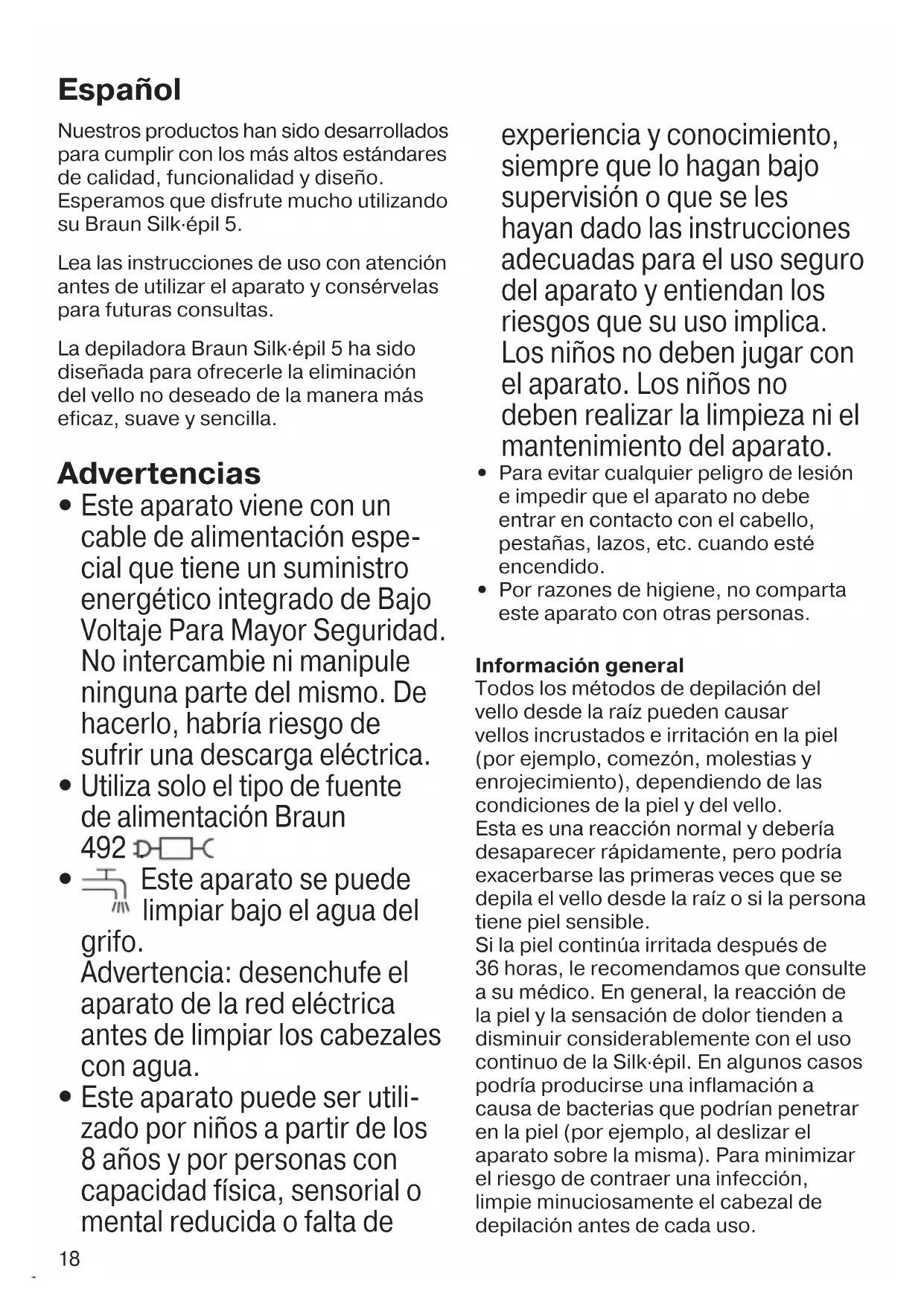 b Recorte de contornos: seleccione « ». c Recorte del vello a 5 mm de longitud: seleccione « » y coloque el accesorio de recorte (I). d Limpieza: No limpie la lámina de afeitado (II) con la escobilla, ya que esto podría dañar la lámina. e Los elementos de corte deben lubricarse cada 3 meses. f Sustituya la estructura de la lámina (II) y el bloque de cuchillas (III) cuando 90340813_SE5_Power_MN.indd 2090340813_SE5_Power_MN.indd 20 02.06.22 10:4902.06.22 10:4921 note que la calidad del afeitado es menor. Puede adquirir las piezas de recambio en su distribuidor, en los Centros de Atención al Cliente Braun o a través de www.service.braun.com. No se depile con una lámina dañada. Eliminación Este producto contiene pilas y residuos eléctricos reciclables. Para proteger el medio ambiente, no lo deseche junto con los residuos domésticos, sino en los puntos locales de recogida. Sujeto a modificaciones si previo aviso. Garantía Braun concede a este producto 2 años de garantía a partir de la fecha de compra. Dentro del periodo de garantía, sub- sanaremos, sin cargo alguno, cualquier defecto del aparato imputable tanto a los materiales como a la fabricación, ya sea reparando, sustituyendo piezas, o facilitando un aparato nuevo según nuestro criterio. La garantía no ampara averías por uso indebido, funcionamiento a distinto voltaje del indicado, conexión a un enchufe inadecuado, rotura, uso o desgaste normal, así como defectos que tengan un efecto insignificante en el valor o funcionamiento del producto. La garantía perderá su efecto en caso de que se realicen reparaciones por parte de personas no autorizadas o de que no se utilicen recambios originales de Braun. La garantía solamente tendrá validez si la fecha de compra es confirmada mediante la factura o el albarán de compra correspondiente. Esta garantía tiene validez en todos los países donde este producto sea distribuido por Braun o por un distribuidor asignado por Braun. En caso de reclamación bajo esta garantía, diríjase al Servicio de Asistencia Técnica de Braun más cercano: www.service.braun.com. Solo para España Servicio al consumidor: Para localizar a su Servicio Braun más cercano o en el caso de que tenga Vd. alguna duda referente al funcionamiento de este producto, le rogamos contacte con el teléfono de este servicio 900 814 208. 90340813_SE5_Power_MN.indd 2190340813_SE5_Power_MN.indd 21 02.06.22 10:4902.06.22 10:4922 Os nossos produtos são concebidos para ir ao encontro dos mais elevados padrões de qualidade, funcionalidade e design. Esperamos que desfrute em pleno da sua Braun Silk·épil 5. Antes de utilizar este aparelho pela pri- meira vez, leia atenta e cuidadosamente as instruções de utilização e guarde-as para consulta futura. A Braun Silk·épil 5 foi concebida para fazer com que a remoção dos pelos indesejados seja o mais eficiente, suave e fácil possível. Aviso