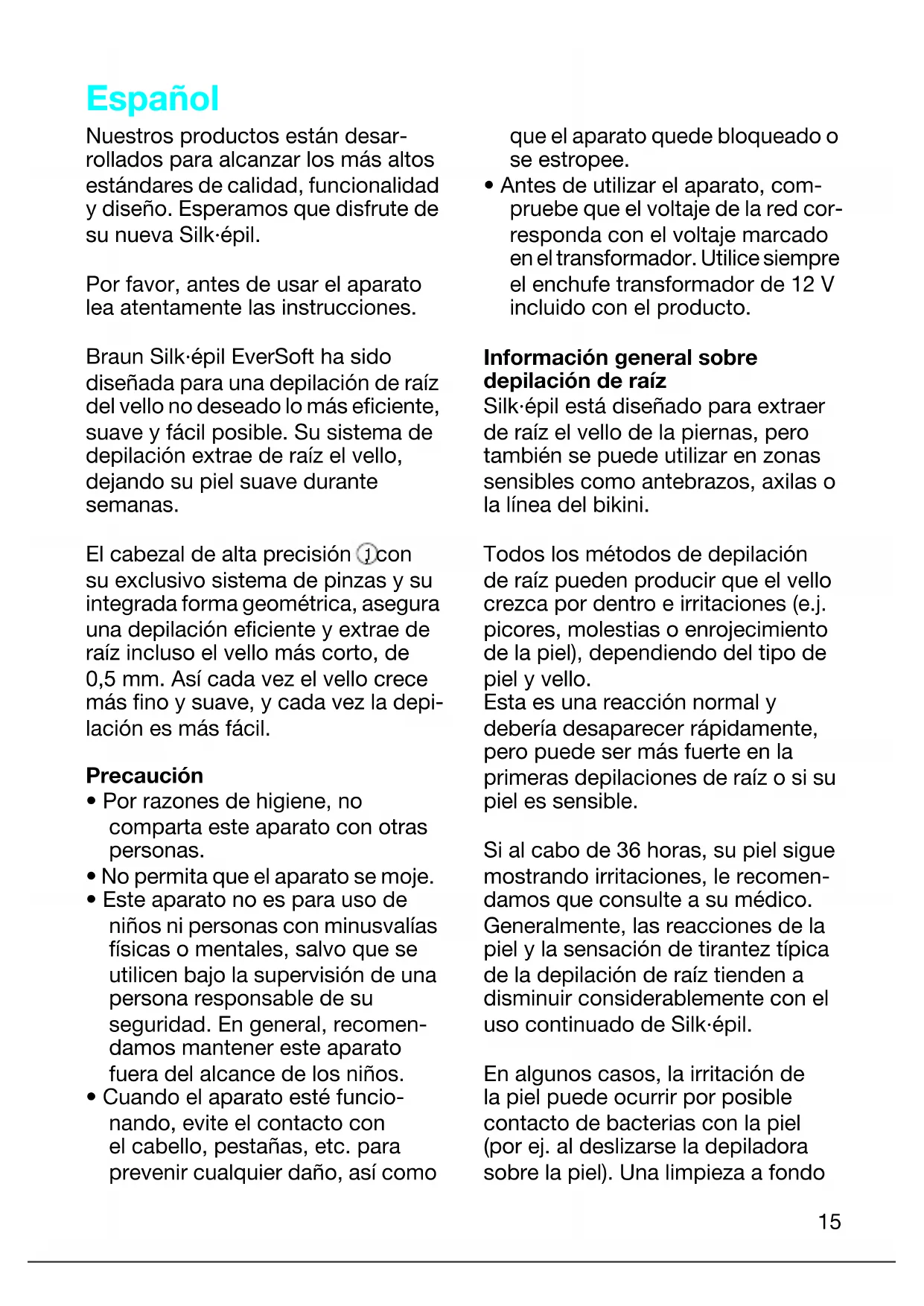 5366377_SE2180_P6-52 Seite 14 Donnerstag, 13. Dezember 2007 3:39 1515 Español Nuestros productos están desar- rollados para alcanzar los más altos estándares de calidad, funcionalidad y diseño. Esperamos que disfrute de su nueva Silk·épil. Por favor, antes de usar el aparato lea atentamente las instrucciones. Braun Silk·épil EverSoft ha sido diseñada para una depilación de raíz del vello no deseado lo más eficiente, suave y fácil posible. Su sistema de depilación extrae de raíz el vello, dejando su piel suave durante semanas. El cabezal de alta precisión , con su exclusivo sistema de pinzas y su integrada forma geométrica, asegura una depilación eficiente y extrae de raíz incluso el vello más corto, de 0,5 mm. Así cada vez el vello crece más fino y suave, y cada vez la depi- lación es más fácil. Precaución