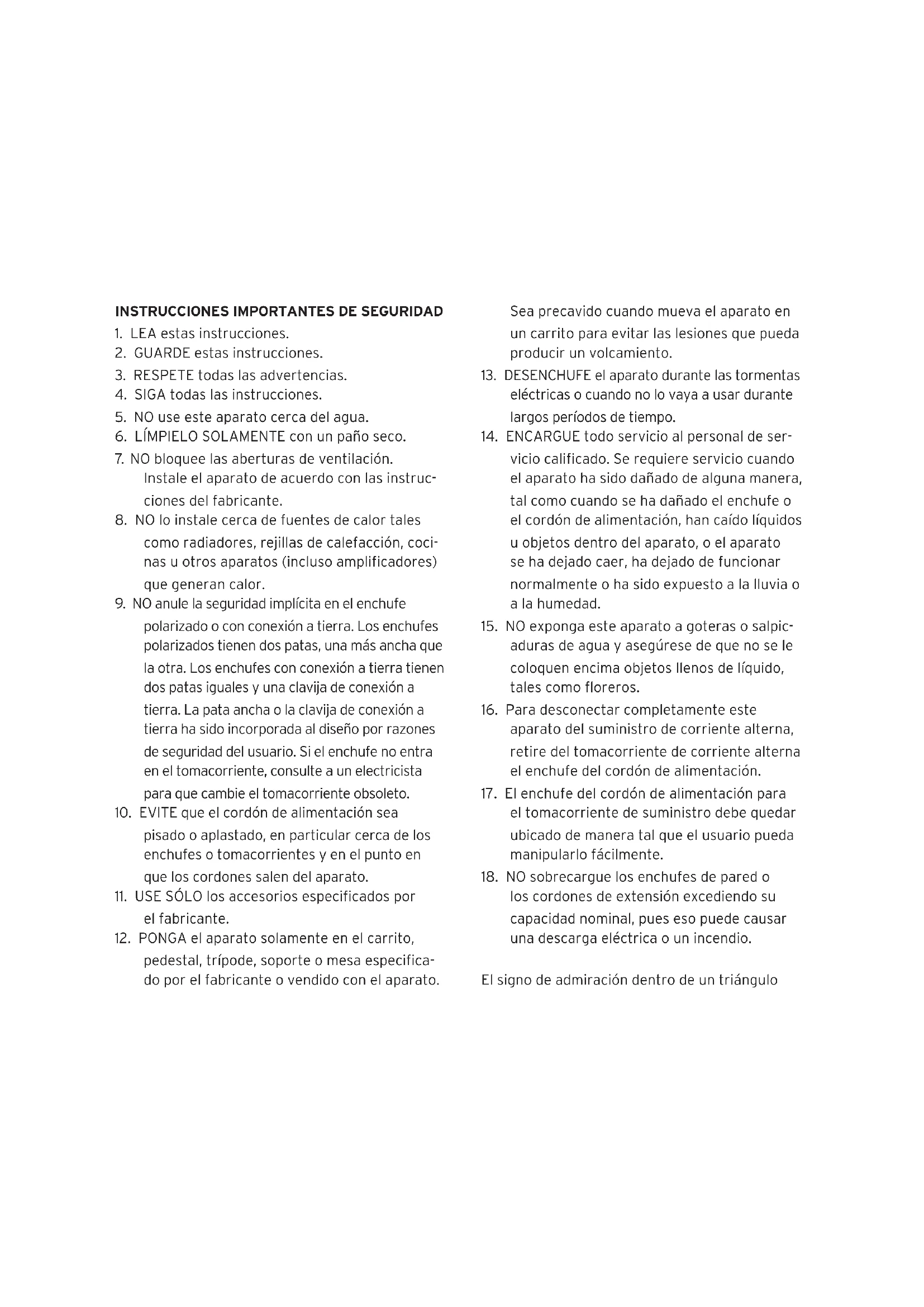 vicio calificado. Se requiere servicio cuando el aparato ha sido dañado de alguna manera, tal como cuando se ha dañado el enchufe o el cordón de alimentación, han caído líquidos u objetos dentro del aparato, o el aparato se ha dejado caer, ha dejado de funcionar normalmente o ha sido expuesto a la lluvia o a la humedad.