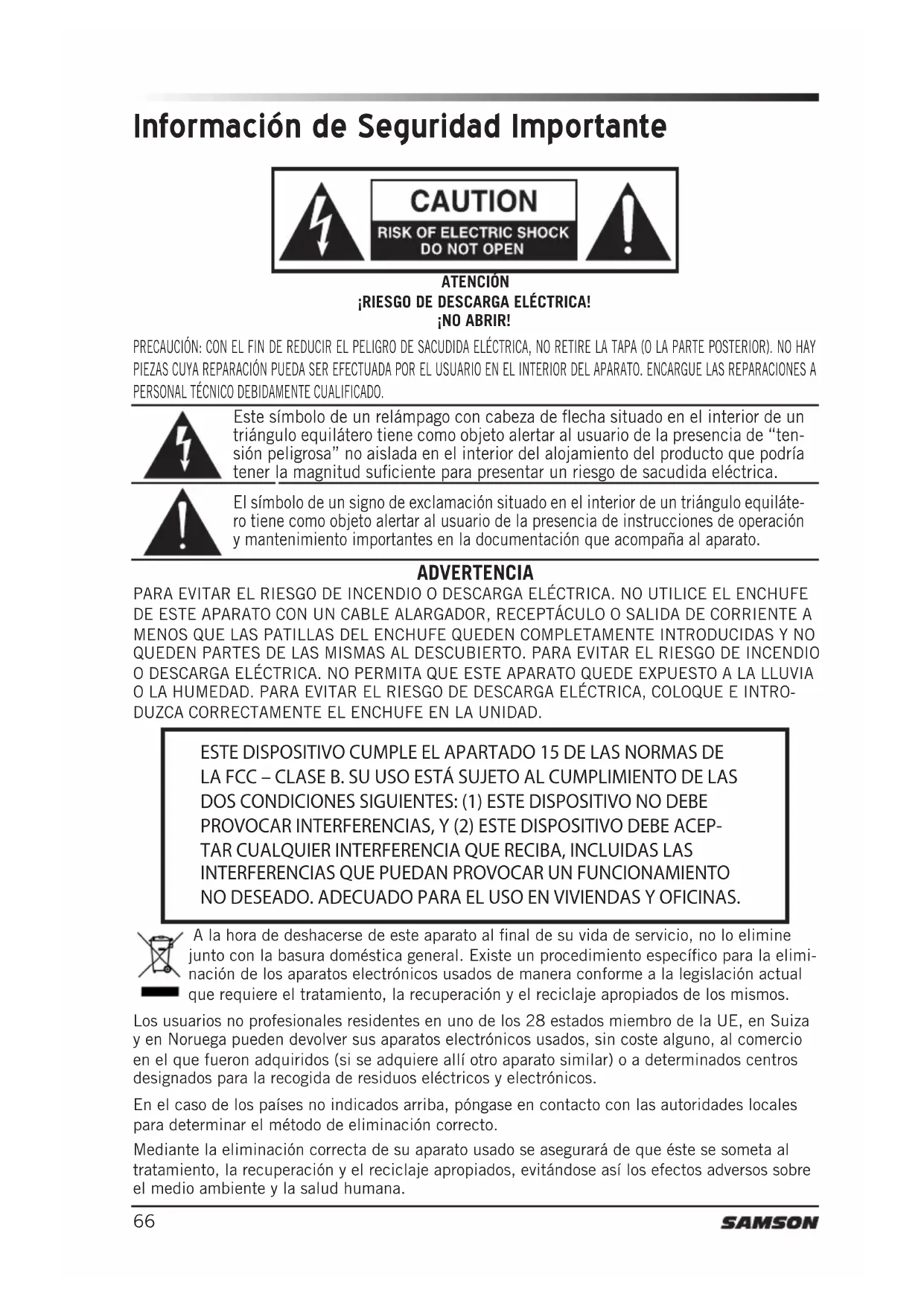 NO DESEADO. ADECUADO PARA EL USO EN VIVIENDAS Y OFICINAS. Información de Seguridad Importante PRECAUCIÓN: CON EL FIN DE REDUCIR EL PELIGRO DE SACUDIDA ELÉCTRICA, NO RETIRE LA TAPA (O LA PARTE POSTERIOR). NO HAY PIEZAS CUYA REPARACIÓN PUEDA SER EFECTUADA POR EL USUARIO EN EL INTERIOR DEL APARATO. ENCARGUE LAS REPARACIONES A PERSONAL TÉCNICO DEBIDAMENTE CUALIFICADO. Este símbolo de un relámpago con cabeza de flecha situado en el interior de un triángulo equilátero tiene como objeto alertar al usuario de la presencia de “ten- sión peligrosa” no aislada en el interior del alojamiento del producto que podría tener la magnitud suficiente para presentar un riesgo de sacudida eléctrica. El símbolo de un signo de exclamación situado en el interior de un triángulo equiláte- ro tiene como objeto alertar al usuario de la presencia de instrucciones de operación y mantenimiento importantes en la documentación que acompaña al aparato. ATENCIÓN ¡RIESGO DE DESCARGA ELÉCTRICA! ¡NO ABRIR! ADVERTENCIA PARA EVITAR EL RIESGO DE INCENDIO O DESCARGA ELÉCTRICA. NO UTILICE EL ENCHUFE DE ESTE APARATO CON UN CABLE ALARGADOR, RECEPTÁCULO O SALIDA DE CORRIENTE A MENOS QUE LAS PATILLAS DEL ENCHUFE QUEDEN COMPLETAMENTE INTRODUCIDAS Y NO QUEDEN PARTES DE LAS MISMAS AL DESCUBIERTO. PARA EVITAR EL RIESGO DE INCENDIO O DESCARGA ELÉCTRICA. NO PERMITA QUE ESTE APARATO QUEDE EXPUESTO A LA LLUVIA O LA HUMEDAD. PARA EVITAR EL RIESGO DE DESCARGA ELÉCTRICA, COLOQUE E INTRO- DUZCA CORRECTAMENTE EL ENCHUFE EN LA UNIDAD. A la hora de deshacerse de este aparato al final de su vida de servicio, no lo elimine junto con la basura doméstica general. Existe un procedimiento específico para la elimi- nación de los aparatos electrónicos usados de manera conforme a la legislación actual que requiere el tratamiento, la recuperación y el reciclaje apropiados de los mismos. Los usuarios no profesionales residentes en uno de los 28 estados miembro de la UE, en Suiza y en Noruega pueden devolver sus aparatos electrónicos usados, sin coste alguno, al comercio en el que fueron adquiridos (si se adquiere allí otro aparato similar) o a determinados centros designados para la recogida de residuos eléctricos y electrónicos. En el caso de los países no indicados arriba, póngase en contacto con las autoridades locales para determinar el método de eliminación correcto. Mediante la eliminación correcta de su aparato usado se asegurará de que éste se someta al tratamiento, la recuperación y el reciclaje apropiados, evitándose así los efectos adversos sobre el medio ambiente y la salud humana.67 Sistema Inalámbrico Concert 88 ENGLISH