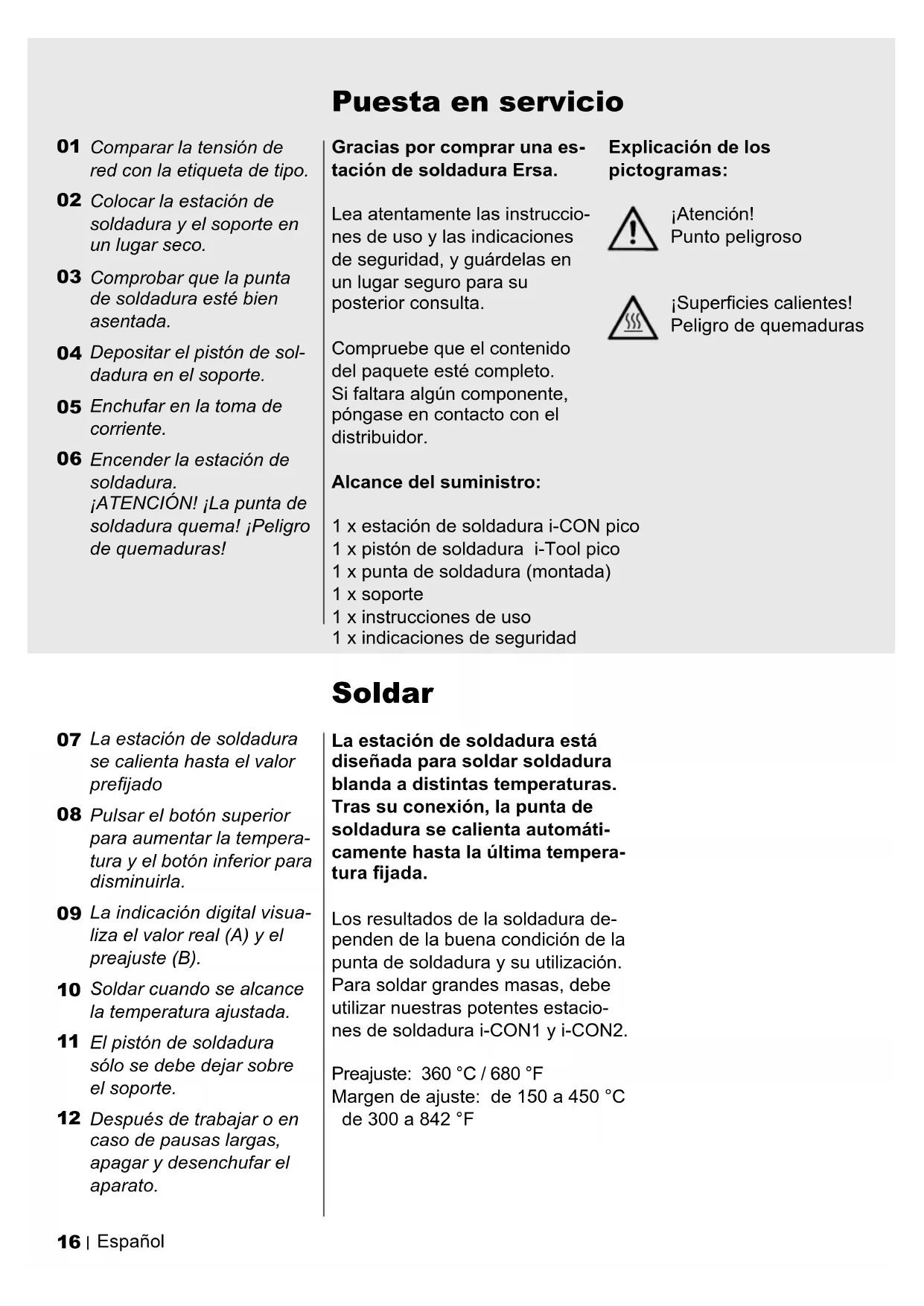 Encender la estación de soldadura. ¡ATENCIÓN! ¡La punta de soldadura quema! ¡Peligro de quemaduras! Explicación de los pictogramas: ¡Atención! Punto peligroso ¡Supercies calientes! Peligro de quemaduras Gracias por comprar una es- tación de soldadura Ersa. Lea atentamente las instruccio- nes de uso y las indicaciones de seguridad, y guárdelas en un lugar seguro para su posterior consulta. Compruebe que el contenido del paquete esté completo. Si faltara algún componente, póngase en contacto con el distribuidor. Alcance del suministro: 1 x estación de soldadura i-CON pico 1 x pistón de soldadura i-Tool pico 1 x punta de soldadura (montada) 1 x soporte 1 x instrucciones de uso 1 x indicaciones de seguridad Soldar