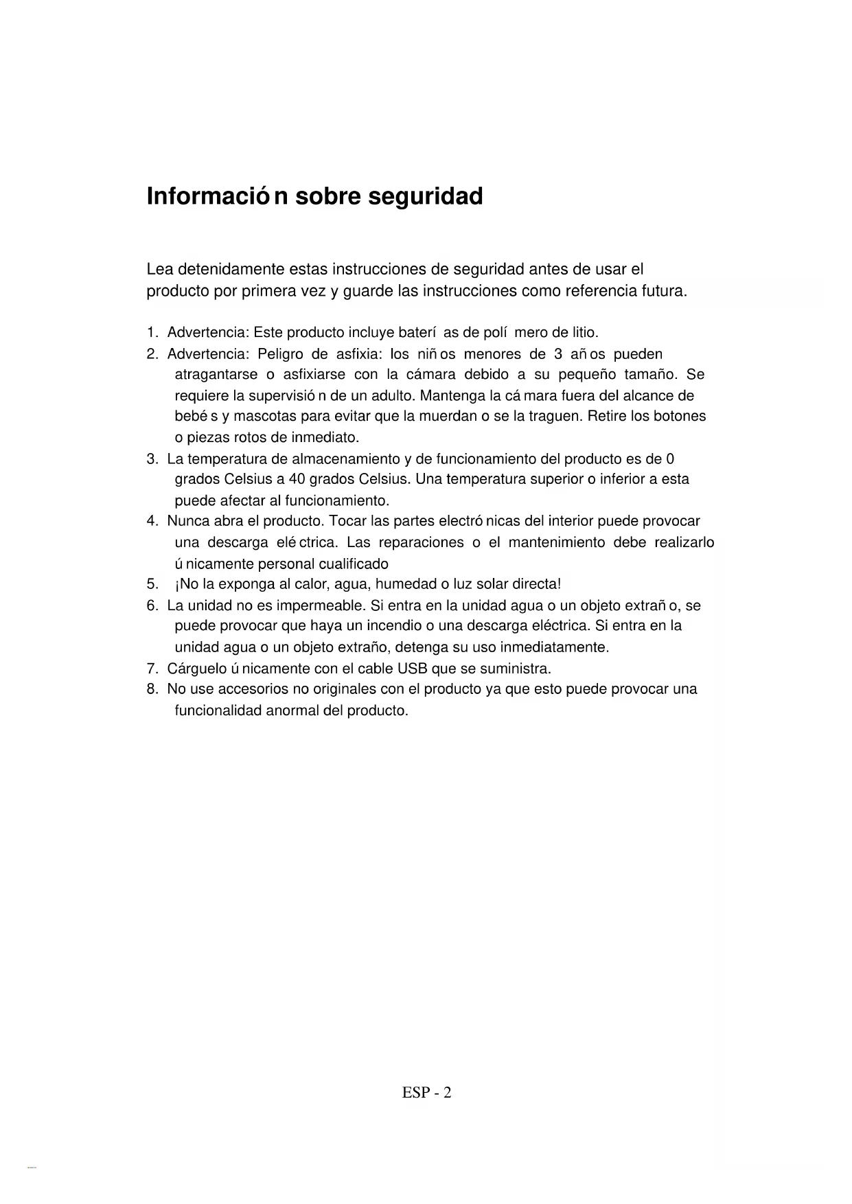 atragantarse o asfixiarse con la cámara debido a su pequeño tamaño. Se requiere la supervisión de un adulto. Mantenga la cámara fuera del alcance de bebés y mascotas para evitar que la muerdan o se la traguen. Retire los botones o piezas rotos de inmediato.