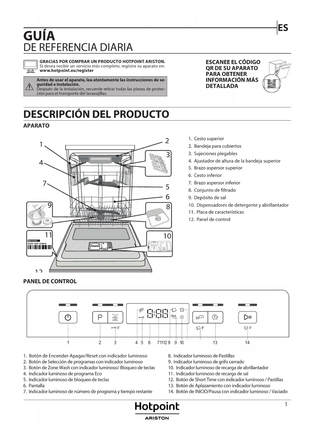 GRACIAS POR COMPRAR UN PRODUCTO HOTPOINT ARISTON. Si desea recibir un servicio más completo, registre su aparato en: www.hotpoint.eu/register Antes de usar el aparato, lea atentamente las instrucciones de se- guridad e instalación. Después de la instalación, recuerde retirar todas las piezas de protec- ción para el transporte del lavavajillas. ESCANEE EL CÓDIGO QR DE SU APARATO PARA OBTENER INFORMACIÓN MÁS DETALLADA2 PRIMER USO