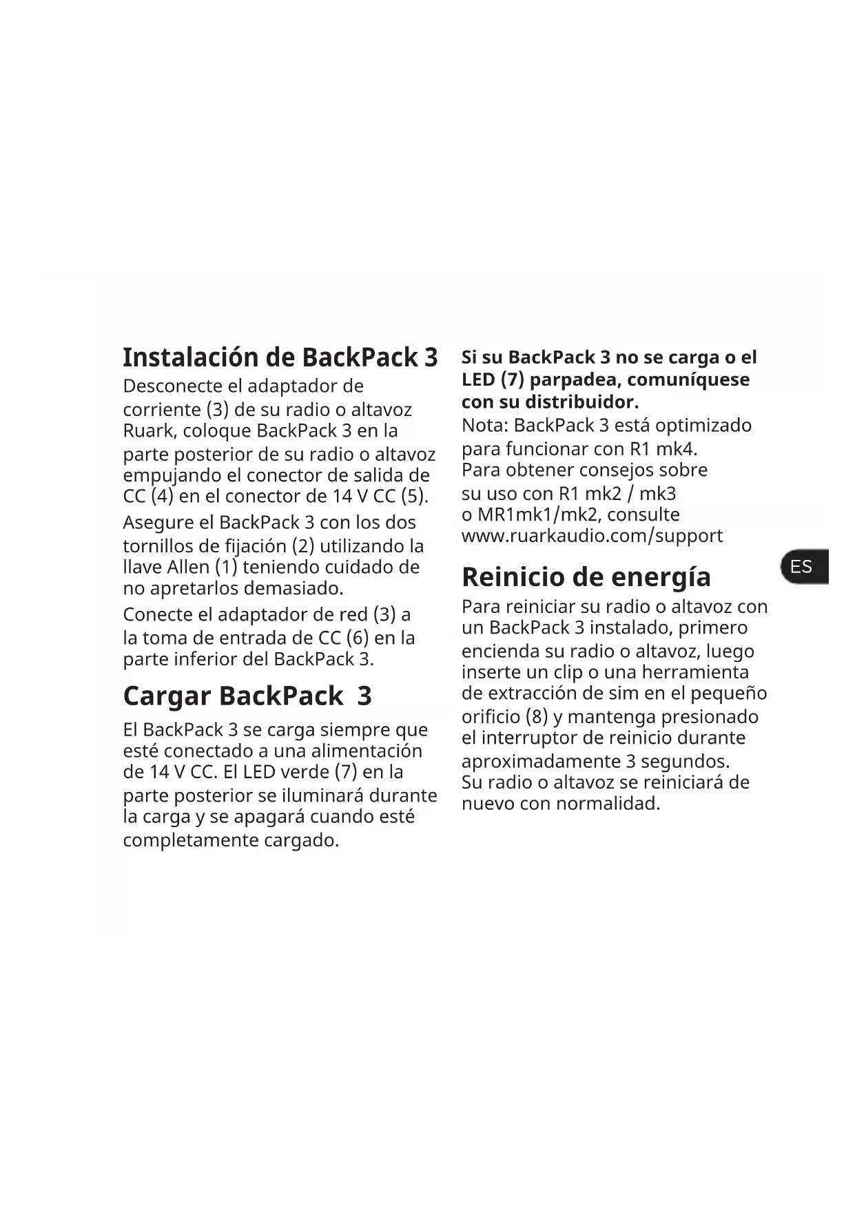 Instalación de BackPack 3 Desconecte el adaptador de corriente (3) de su radio o altavoz Ruark, coloque BackPack 3 en la parte posterior de su radio o altavoz empujando el conector de salida de CC (4) en el conector de 14 V CC (5). Asegure el BackPack 3 con los dos tornillos de jación (2) utilizando la llave Allen (1) teniendo cuidado de no apretarlos demasiado. Conecte el adaptador de red (3) a la toma de entrada de CC (6) en la parte inferior del BackPack 3. Cargar BackPack 3 El BackPack 3 se carga siempre que esté conectado a una alimentación de 14 V CC. El LED verde (7) en la parte posterior se iluminará durante la carga y se apagará cuando esté completamente cargado. Si su BackPack 3 no se carga o el LED (7) parpadea, comuníquese con su distribuidor. Nota: BackPack 3 está optimizado para funcionar con R1 mk4. Para obtener consejos sobre su uso con R1 mk2 / mk3 o MR1mk1/mk2, consulte www.ruarkaudio.com/support Reinicio de energía Para reiniciar su radio o altavoz con un BackPack 3 instalado, primero encienda su radio o altavoz, luego inserte un clip o una herramienta de extracción de sim en el pequeño oricio (8) y mantenga presionado el interruptor de reinicio durante aproximadamente 3 segundos. Su radio o altavoz se reiniciará de nuevo con normalidad.Información de seguridad