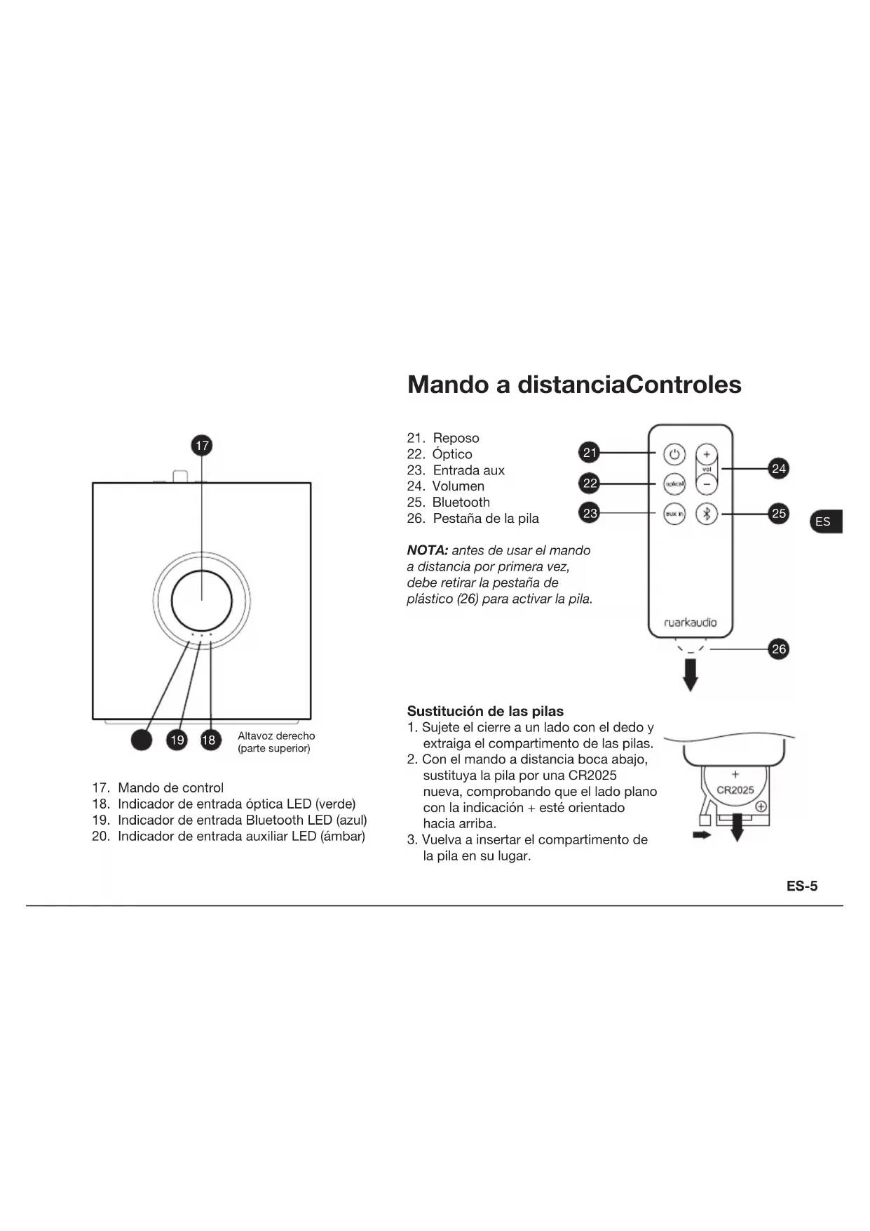 AVISO DE SEGURIDAD DE LAS PILAS BOTÓN DE LITIO. El mando a distancia contiene una pila botón de litio que, si se ingiere, puede causar quemaduras químicas. Mantenga las pilas nuevas y usadas fuera del alcance de los niños. Si cree que las pilas se han podido ingerir, busque atención médica de inmediato. No manipule pilas con pérdidas o dañadas. Peligro de explosión en caso de que la pila no esté correctamente colocada. Cambie sólo por el mismo tipo de pila o uno equivalente.Este dispositivo se ha etiquetado de acuerdo con la Directiva Europea 2012/19/EU relativa a los residuos de aparatos eléctricos y electrónicos. Este símbolo indica que el producto o las pilas asociadas no deben desecharse como residuos domésticos generales. Como cualquier equipo eléctrico, debe desecharse de acuerdo con la normativa local.INFORMACIÓN DE CONFORMIDAD CE Este producto cumple todos los requisitos de las directivas europeas vigentes. Puede obtener una copia gratuita de la declaración de conformidad poniéndose en contacto con su establecimiento, distribuidor o con Ruark Audio.Por la presente, Ruark Audio declara que este dispositivo cumple los requisitos básicos y cualquier otra disposición pertinente a la Directiva Europea 2014/53/UE relativa a la comercialización de equipos radioeléctricos.Puede descargar el texto completo de la Declaración de Conformidad EC en www.ruarkaudio.com/doc/MR1mk2doc.pdf Especificaciones Altavoces MR1 mk2