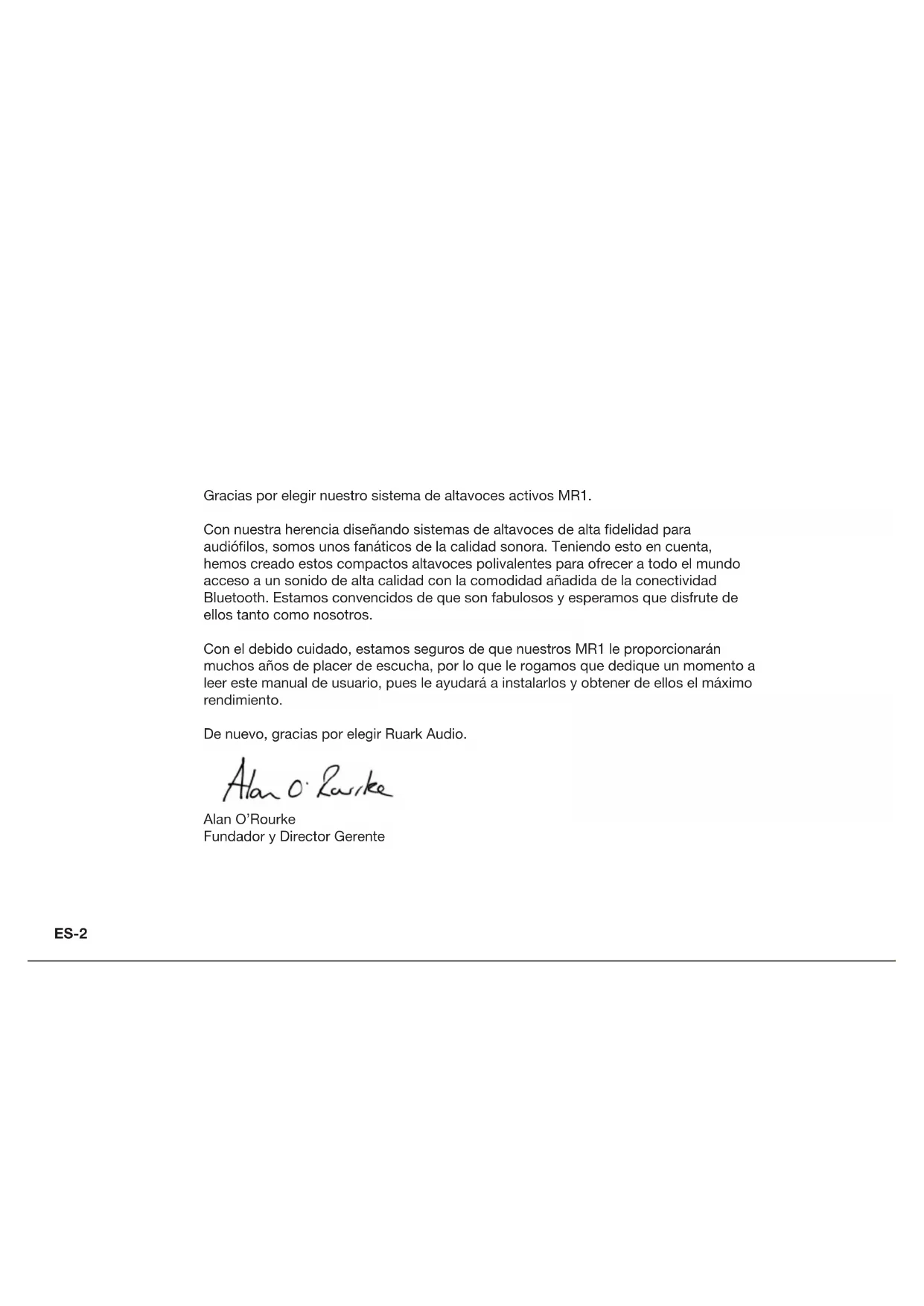 NOES-2 Gracias por elegir nuestro sistema de altavoces activos MR1. Con nuestra herencia diseñando sistemas de altavoces de alta delidad para audiólos, somos unos fanáticos de la calidad sonora. Teniendo esto en cuenta, hemos creado estos compactos altavoces polivalentes para ofrecer a todo el mundo acceso a un sonido de alta calidad con la comodidad añadida de la conectividad Bluetooth. Estamos convencidos de que son fabulosos y esperamos que disfrute de ellos tanto como nosotros. Con el debido cuidado, estamos seguros de que nuestros MR1 le proporcionarán muchos años de placer de escucha, por lo que le rogamos que dedique un momento a leer este manual de usuario, pues le ayudará a instalarlos y obtener de ellos el máximo rendimiento. De nuevo, gracias por elegir Ruark Audio. Alan O’Rourke Fundador y Director GerenteES-3