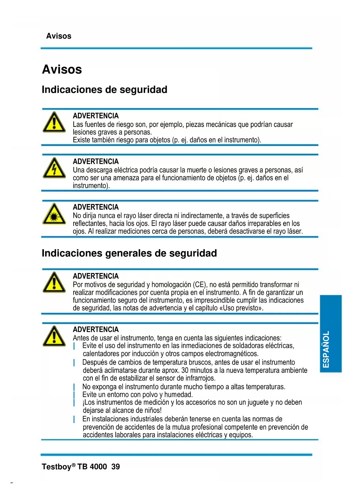 ADVERTENCIA Antes de usar el instrumento, tenga en cuenta las siguientes indicaciones: | Evite el uso del instrumento en las inmediaciones de soldadoras eléctricas, calentadores por inducción y otros campos electromagnéticos. | Después de cambios de temperatura bruscos, antes de usar el instrumento deberá aclimatarse durante aprox. 30 minutos a la nueva temperatura ambiente con el fin de estabilizar el sensor de infrarrojos. | No exponga el instrumento durante mucho tiempo a altas temperaturas. | Evite un entorno con polvo y humedad. | ¡Los instrumentos de medición y los accesorios no son un juguete y no deben dejarse al alcance de niños! | En instalaciones industriales deberán tenerse en cuenta las normas de prevención de accidentes de la mutua profesional competente en prevención de accidentes laborales para instalaciones eléctricas y equipos.Avisos 40 Testboy