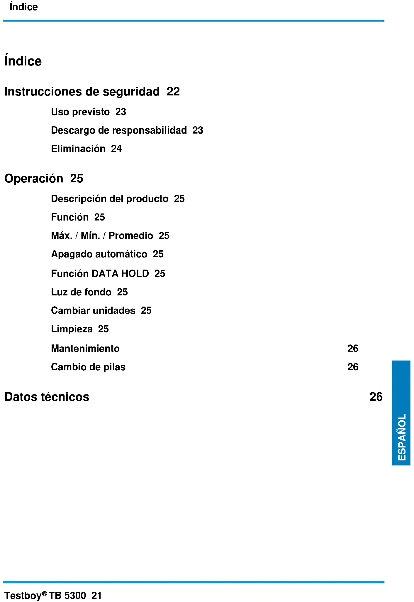 TB 5300 21 ESPAÑOL Índice Instrucciones de seguridad 22 Uso previsto 23 Descargo de responsabilidad 23 Eliminación 24 Operación 25 Descripción del producto 25 Función 25 Máx. / Mín. / Promedio 25 Apagado automático 25 Función DATA HOLD 25 Luz de fondo 25 Cambiar unidades 25 Limpieza 25 Mantenimiento 26 Cambio de pilas 26 Datos técnicos 26Instrucciones de seguridad 22 Testboy