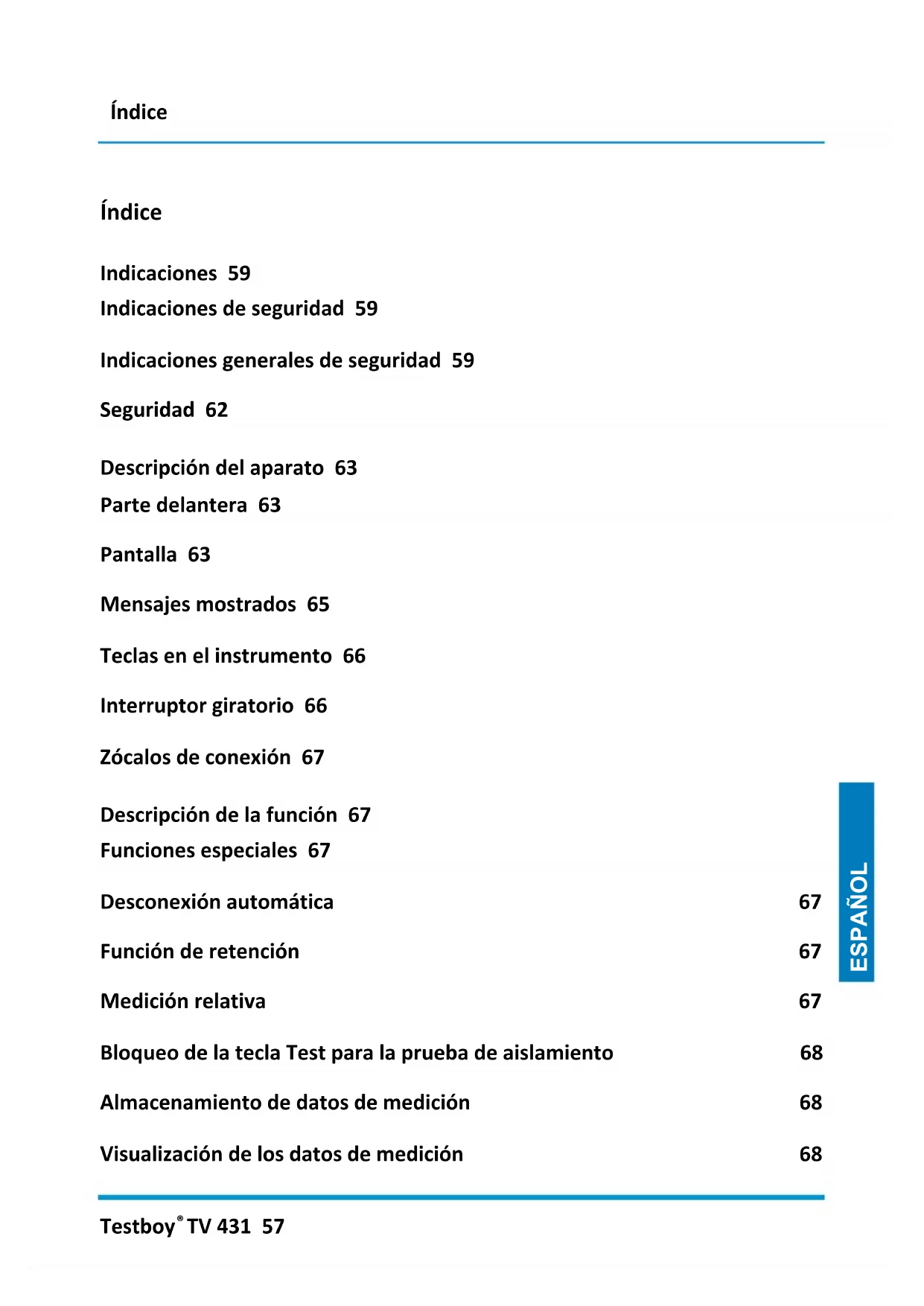 TV 431 57 ESPAÑOL Índice Indicaciones 59 Indicaciones de seguridad 59 Indicaciones generales de seguridad 59 Seguridad 62 Descripción del aparato 63 Parte delantera 63 Pantalla 63 Mensajes mostrados 65 Teclas en el instrumento 66 Interruptor giratorio 66 Zócalos de conexión 67 Descripción de la función 67 Funciones especiales 67 Desconexión automática 67 Función de retención 67 Medición relativa 67 Bloqueo de la tecla Test para la prueba de aislamiento 68 Almacenamiento de datos de medición 68 Visualización de los datos de medición 68Índice Testboy