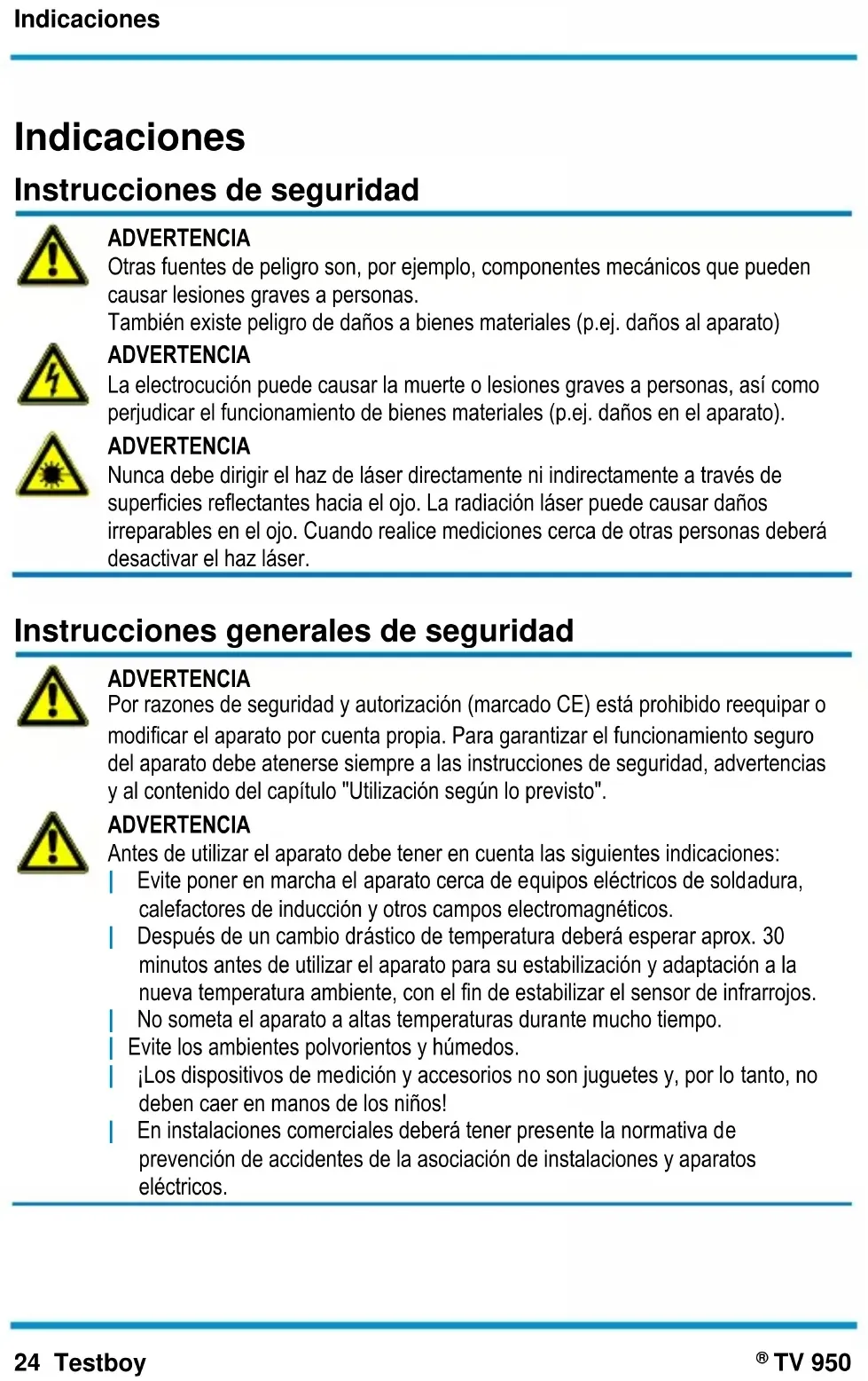 ADVERTENCIA Antes de utilizar el aparato debe tener en cuenta las siguientes indicaciones: | Evite poner en marcha el aparato cerca de equipos eléctricos de soldadura, calefactores de inducción y otros campos electromagnéticos. | Después de un cambio drástico de temperatura deberá esperar aprox. 30 minutos antes de utilizar el aparato para su estabilización y adaptación a la nueva temperatura ambiente, con el fin de estabilizar el sensor de infrarrojos. | No someta el aparato a altas temperaturas durante mucho tiempo. | Evite los ambientes polvorientos y húmedos. | ¡Los dispositivos de medición y accesorios no son juguetes y, por lo tanto, no deben caer en manos de los niños! | En instalaciones comerciales deberá tener presente la normativa de prevención de accidentes de la asociación de instalaciones y aparatos eléctricos.Indicaciones Testboy