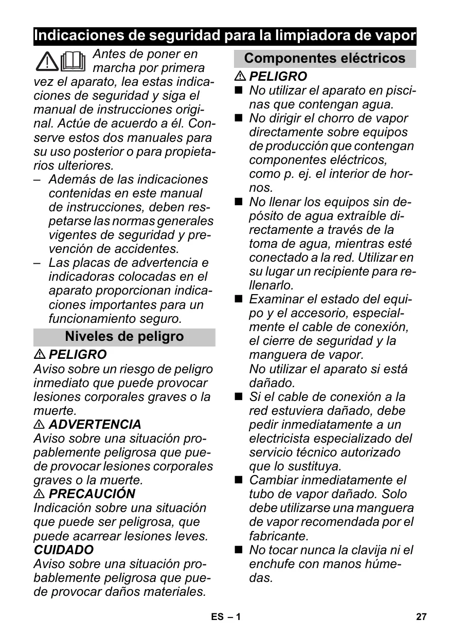 Indicaciones de seguridad para la limpiadora de vapor Antes de poner en marcha por primera vez el aparato, lea estas indicaciones de seguridad y siga el manual de instrucciones original. Actúe de acuerdo a él. Conserve estos dos manuales para su uso posterior o para propietarios ulteriores. – Además de las indicaciones contenidas en este manual de instrucciones, deben respetarse las normas generales vigentes de seguridad y prevención de accidentes. – Las placas de advertencia e indicadoras colocadas en el aparato proporcionan indicaciones importantes para un funcionamiento seguro. Niveles de peligro PELIGRO Aviso sobre un riesgo de peligro inmediato que puede provocar lesiones corporales graves o la muerte. 몇 ADVERTENCIA Aviso sobre una situación propablemente peligrosa que puede provocar lesiones corporales graves o la muerte. 몇 PRECAUCIÓN Indicación sobre una situación que puede ser peligrosa, que puede acarrear lesiones leves. CUIDADO Aviso sobre una situación probablemente peligrosa que puede provocar daños materiales. Componentes eléctricos PELIGRO No utilizar el aparato en piscinas que contengan agua. No dirigir el chorro de vapor directamente sobre equipos de producción que contengan componentes eléctricos, como p. ej. el interior de hornos. No llenar los equipos sin depósito de agua extraíble directamente a través de la toma de agua, mientras esté conectado a la red. Utilizar en su lugar un recipiente para rellenarlo. Examinar el estado del equipo y el accesorio, especialmente el cable de conexión, el cierre de seguridad y la manguera de vapor. No utilizar el aparato si está dañado. Si el cable de conexión a la red estuviera dañado, debe pedir inmediatamente a un electricista especializado del servicio técnico autorizado que lo sustituya. Cambiar inmediatamente el tubo de vapor dañado. Solo debe utilizarse una manguera de vapor recomendada por el fabricante. No tocar nunca la clavija ni el enchufe con manos húmedas. ES – 1