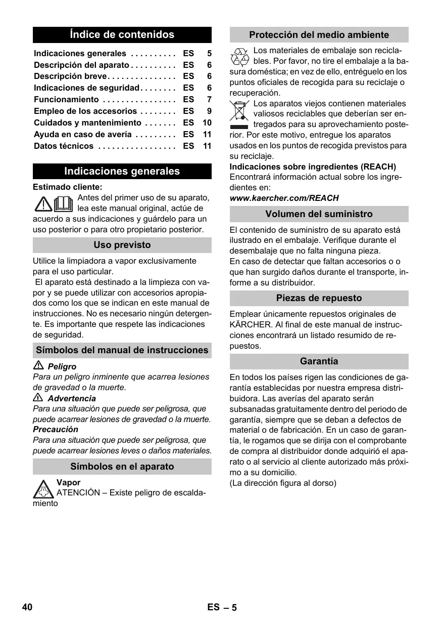 Volumen del suministro El contenido de suministro de su aparato está ilustrado en el embalaje. Verifique durante el desembalaje que no falta ninguna pieza. En caso de detectar que faltan accesorios o o que han surgido daños durante el transporte, informe a su distribuidor. Piezas de repuesto Emplear únicamente repuestos originales de KÄRCHER. Al final de este manual de instrucciones encontrará un listado resumido de repuestos. Garantía Para un peligro inminente que acarrea lesiones de gravedad o la muerte. 몇 Advertencia Para una situación que puede ser peligrosa, que puede acarrear lesiones de gravedad o la muerte. Precaución Para una situación que puede ser peligrosa, que puede acarrear lesiones leves o daños materiales. Símbolos en el aparato Los materiales de embalaje son reciclables. Por favor, no tire el embalaje a la basura doméstica; en vez de ello, entréguelo en los puntos oficiales de recogida para su reciclaje o recuperación. Los aparatos viejos contienen materiales valiosos reciclables que deberían ser entregados para su aprovechamiento posterior. Por este motivo, entregue los aparatos usados en los puntos de recogida previstos para su reciclaje. Indicaciones sobre ingredientes (REACH) Encontrará información actual sobre los ingredientes en: www.kaercher.com/REACH En todos los países rigen las condiciones de garantía establecidas por nuestra empresa distribuidora. Las averías del aparato serán subsanadas gratuitamente dentro del periodo de garantía, siempre que se deban a defectos de material o de fabricación. En un caso de garantía, le rogamos que se dirija con el comprobante de compra al distribuidor donde adquirió el aparato o al servicio al cliente autorizado más próximo a su domicilio. (La dirección figura al dorso) ES – 5 Descripción del aparato Indicaciones de seguridad El contenido de suministro de su aparato está ilustrado en el embalaje. Verifique durante el desembalaje que no falta ninguna pieza. En caso de detectar que faltan accesorios o o que han surgido daños durante el transporte, informe a su distribuidor. Ilustraciones, véase la contraportada. A1 Piloto de control (verde) de tensión de red disponible A2 Piloto de aviso - calefacción (NARANJA) A3 Cierre de seguridad A4 Soporte para accesorios A5 Soporte de estacionamiento para la boquilla de suelos A6 Cable de conexión a red y enchufe de red A7 Ruedas (2 unidades) A8 Rodillo de dirección B1 Pistola aplicadora de vapor B2 Tecla de desbloqueo B3 Selector de cantidad de vapor (con seguro para niños) B4 Palanca del vapor B5 Manguera de vapor Peligro Está prohibido usar el aparato en zonas en las que exista riesgo de explosiones. Para usar el aparato en zonas de peligro de