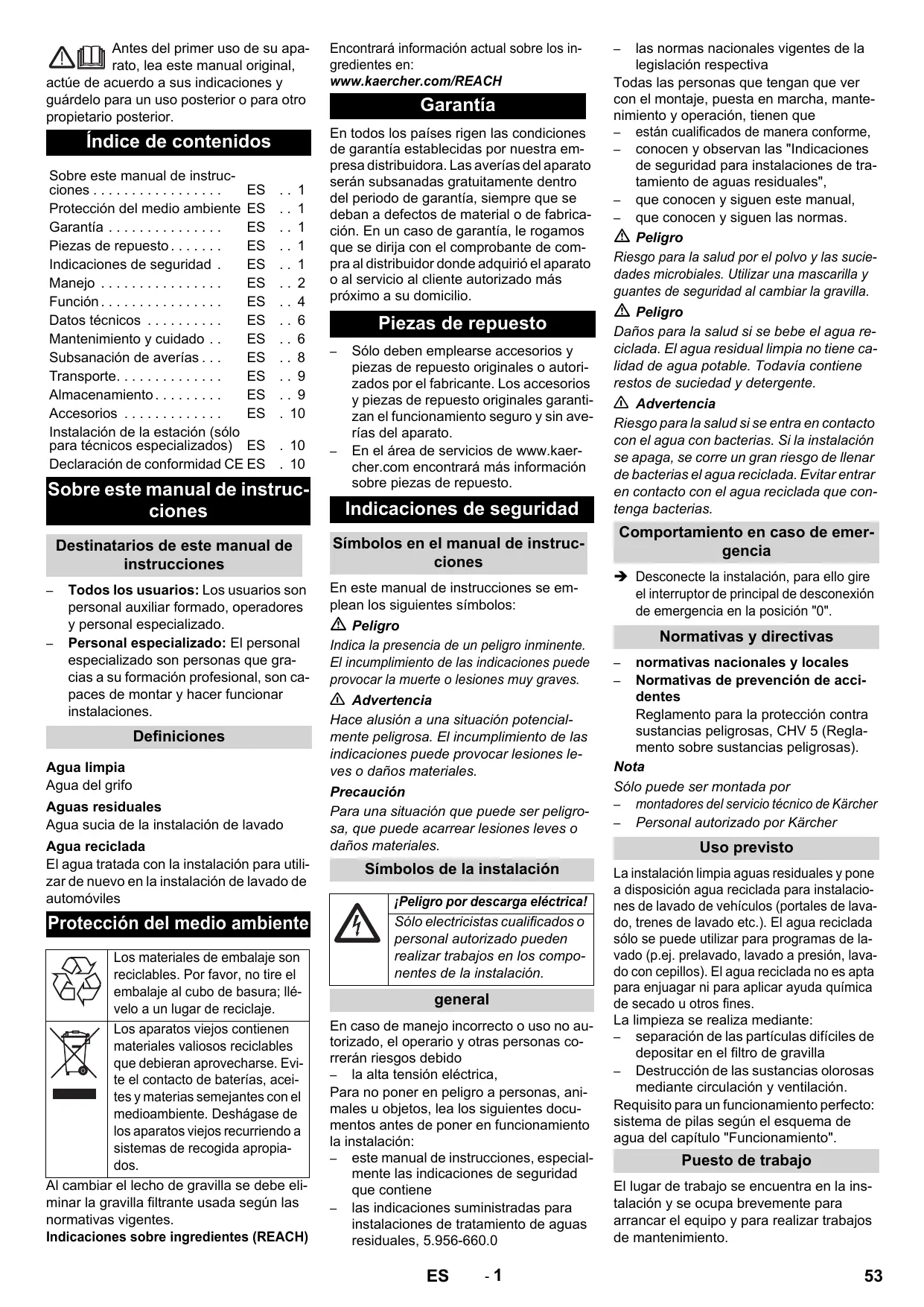 Todos los usuarios: Los usuarios son personal auxiliar formado, operadores y personal especializado. Personal especializado: El personal especializado son personas que gracias a su formación profesional, son capaces de montar y hacer funcionar instalaciones. Definiciones Agua limpia Agua del grifo Aguas residuales Agua sucia de la instalación de lavado Agua reciclada El agua tratada con la instalación para utilizar de nuevo en la instalación de lavado de automóviles Protección del medio ambiente Los materiales de embalaje son reciclables. Por favor, no tire el embalaje al cubo de basura; llévelo a un lugar de reciclaje. Los aparatos viejos contienen materiales valiosos reciclables que debieran aprovecharse. Evite el contacto de baterías, aceites y materias semejantes con el medioambiente. Deshágase de los aparatos viejos recurriendo a sistemas de recogida apropiados. Al cambiar el lecho de gravilla se debe eliminar la gravilla filtrante usada según las normativas vigentes. Indicaciones sobre ingredientes (REACH) En este manual de instrucciones se emplean los siguientes símbolos: Peligro Indica la presencia de un peligro inminente. El incumplimiento de las indicaciones puede provocar la muerte o lesiones muy graves. 몇 Advertencia Hace alusión a una situación potencialmente peligrosa. El incumplimiento de las indicaciones puede provocar lesiones leves o daños materiales. Precaución Para una situación que puede ser peligrosa, que puede acarrear lesiones leves o daños materiales. Símbolos de la instalación ¡Peligro por descarga eléctrica! Sólo electricistas cualificados o personal autorizado pueden realizar trabajos en los componentes de la instalación. general En caso de manejo incorrecto o uso no autorizado, el operario y otras personas correrán riesgos debido – la alta tensión eléctrica, Para no poner en peligro a personas, animales u objetos, lea los siguientes documentos antes de poner en funcionamiento la instalación: – este manual de instrucciones, especialmente las indicaciones de seguridad que contiene – las indicaciones suministradas para instalaciones de tratamiento de aguas residuales, 5.956-660.0