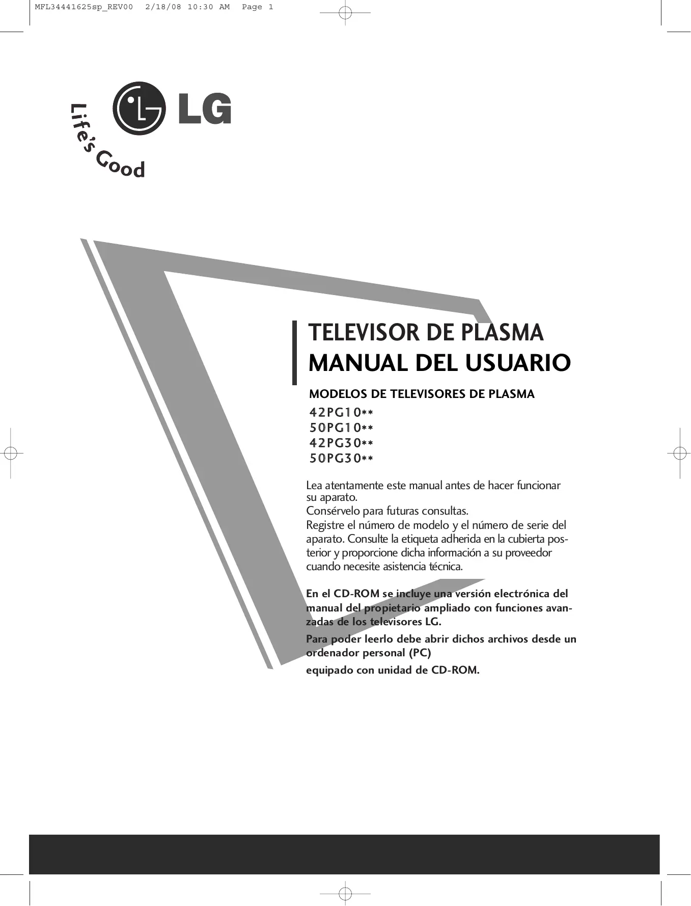 Descarga las instrucciones para tu TELEVISOR en formato PDF gratis! Encuentra tus instrucciones 42PG1000 - LG y toma tu dispositivo electrónico nuevamente en la mano. En esta página están publicados todos los documentos necesarios para el uso de su dispositivo. 42PG1000 de la marca LG.