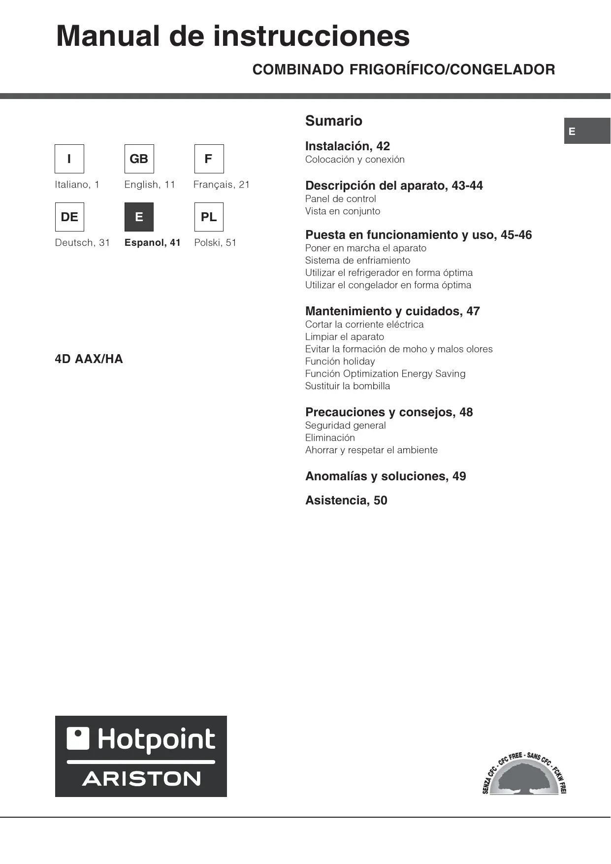 4D AAB/HA, 4D AAB/HA - Frigorífico-congelador combinado HOTPOINT - Manual de uso y guía de instrucciones gratis
