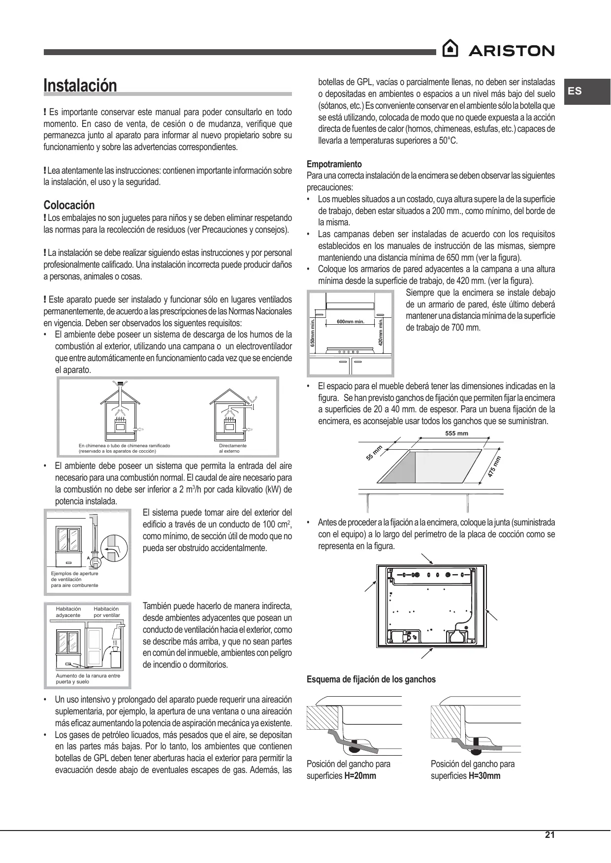 • El espacio para el mueble deberá tener las dimensiones indicadas en la figura. Se han previsto ganchos de fijación que permiten fijar la encimera a superficies de 20 a 40 mm. de espesor. Para un buena fijación de la encimera, es aconsejable usar todos los ganchos que se suministran.